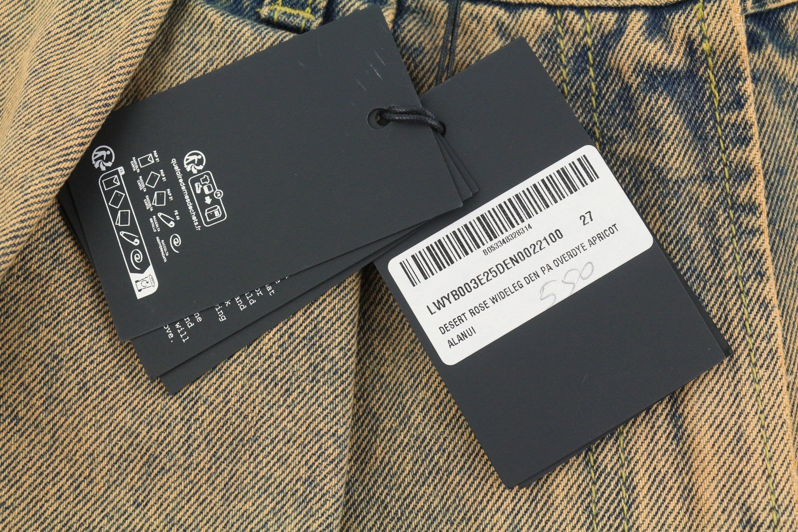ALANUI Desert Rose plačių klešnių moteriški džinsai W27 klostėmis dažytos abrikosinės spalvos džinsinės kelnės RRP550