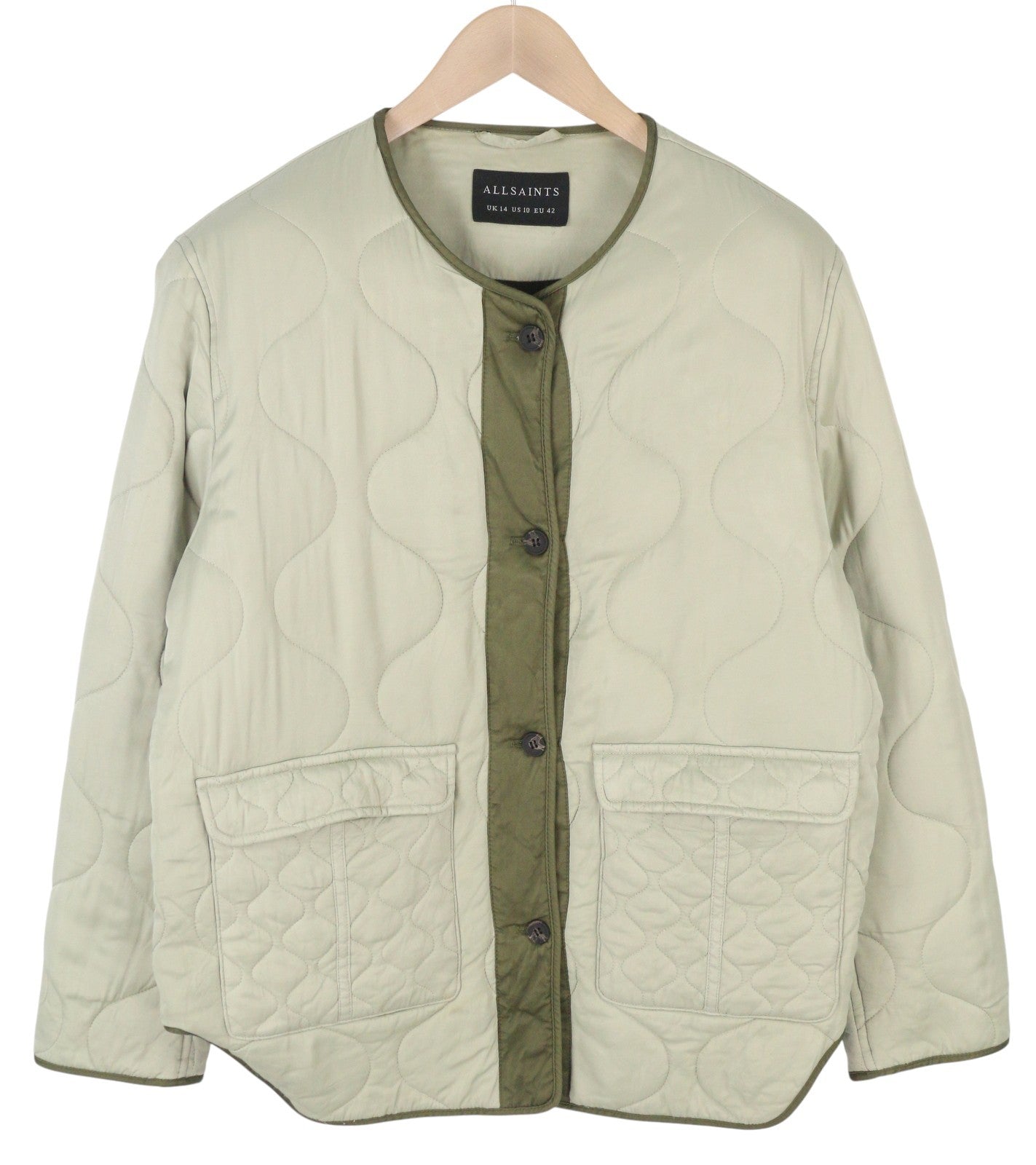 ALLSAINTS Foxi liner moteriškas švarkas EU42 žalias su sagomis ir dygsniuotomis apvalios kaklo kišenėmis