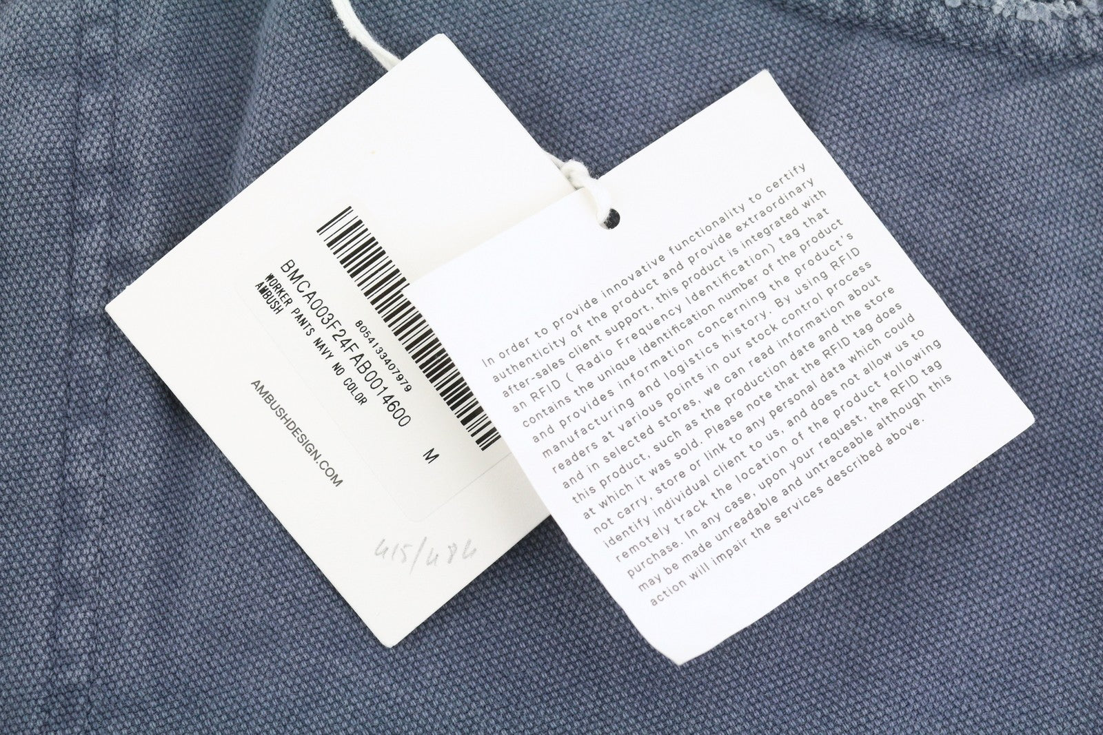 AMBUSH Worker vyriškos kelnės, tamsiai mėlynos, laisvos, įprasto kirpimo, su užtaisytomis kišenėmis, užtrauktuku RRP415