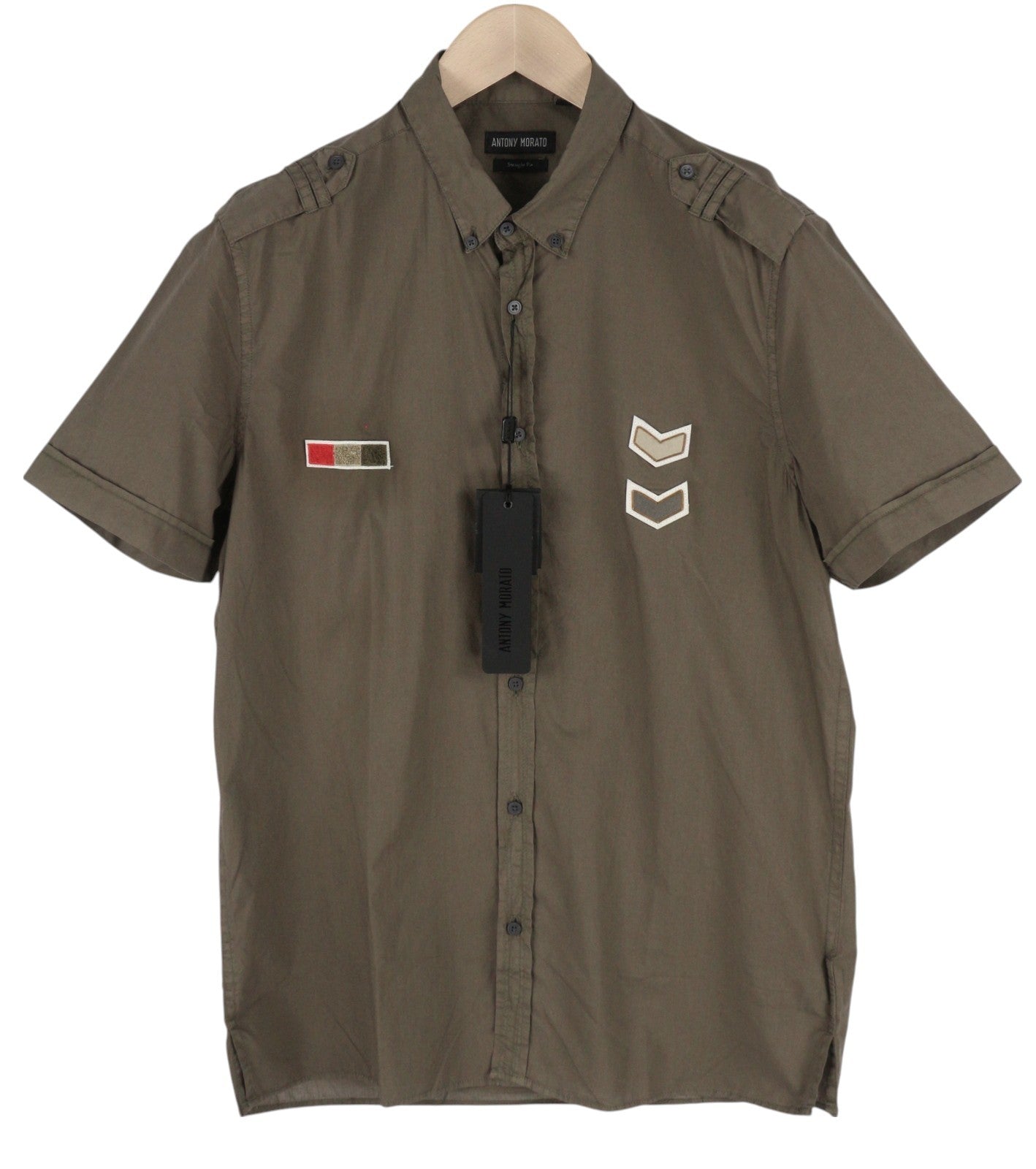 ANTONY MORATO vyriški marškinėliai M rudi, tiesaus kirpimo, su sagomis atlenkiama iškirpte, logotipu, trumpomis rankovėmis