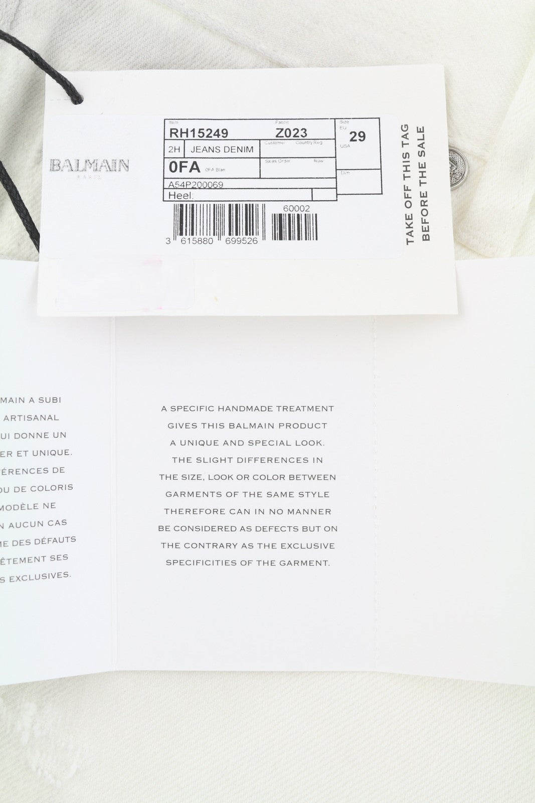 BALMAIN vyriški džinsai 29 balti, tiesūs, suteptos tekstūros, sudegusio nešvaraus audinio efektu (RRP690)