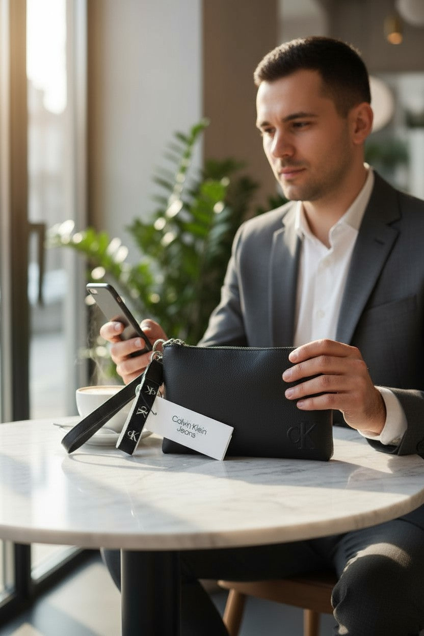 CALVIN KLEIN Make-Up + D-Ring Keyfob vyriška rankinė su juoda ir dengta logotipu, unisex RRP89