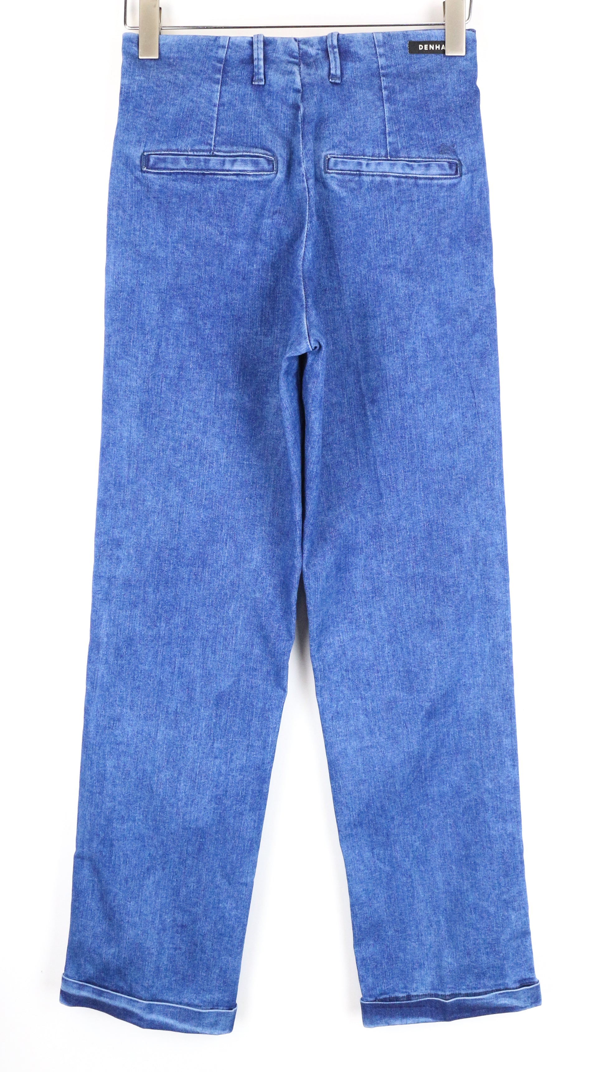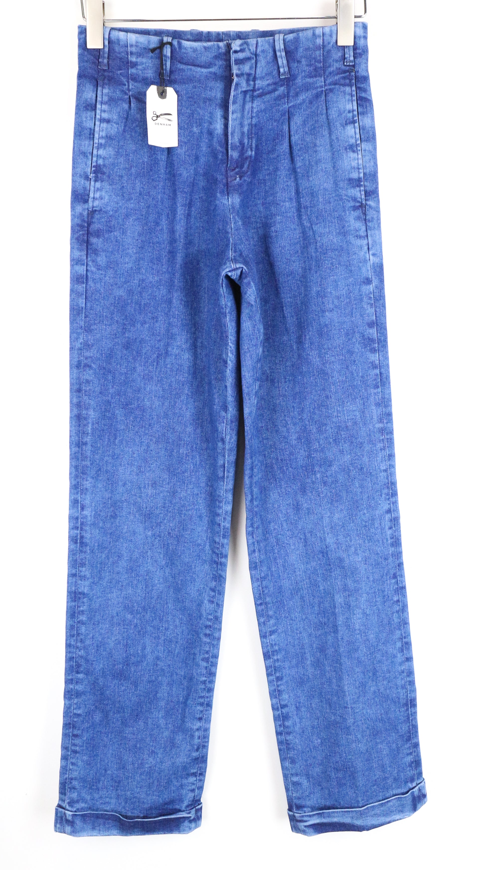 DENHAM Judy Flare moteriški džinsai W26/L32 mėlyni, tamprūs medvilniniai, aukštu juosmeniu, klostuoti