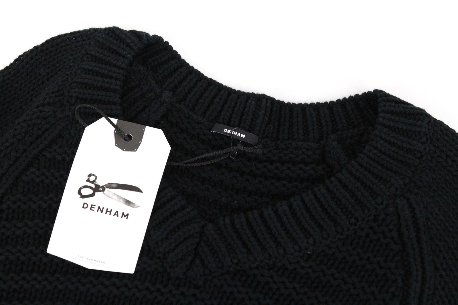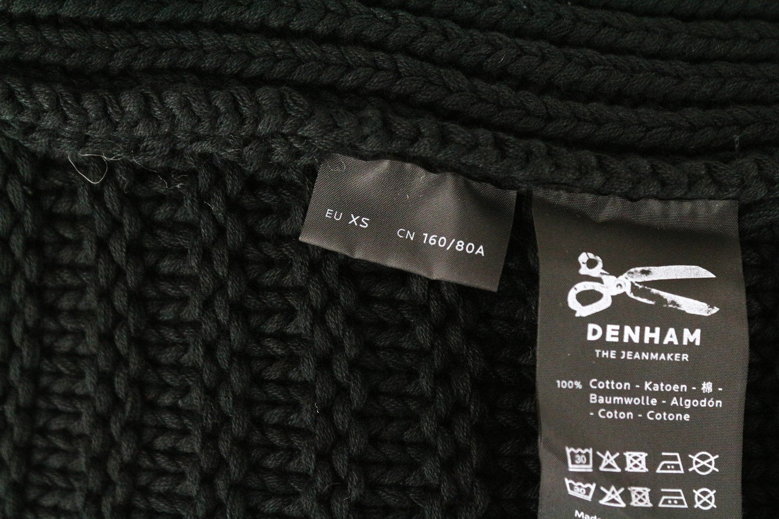 DENHAM Modu moteriškas XS dydžio juodas grynos medvilnės megztinis ilgomis rankovėmis V formos iškirpte