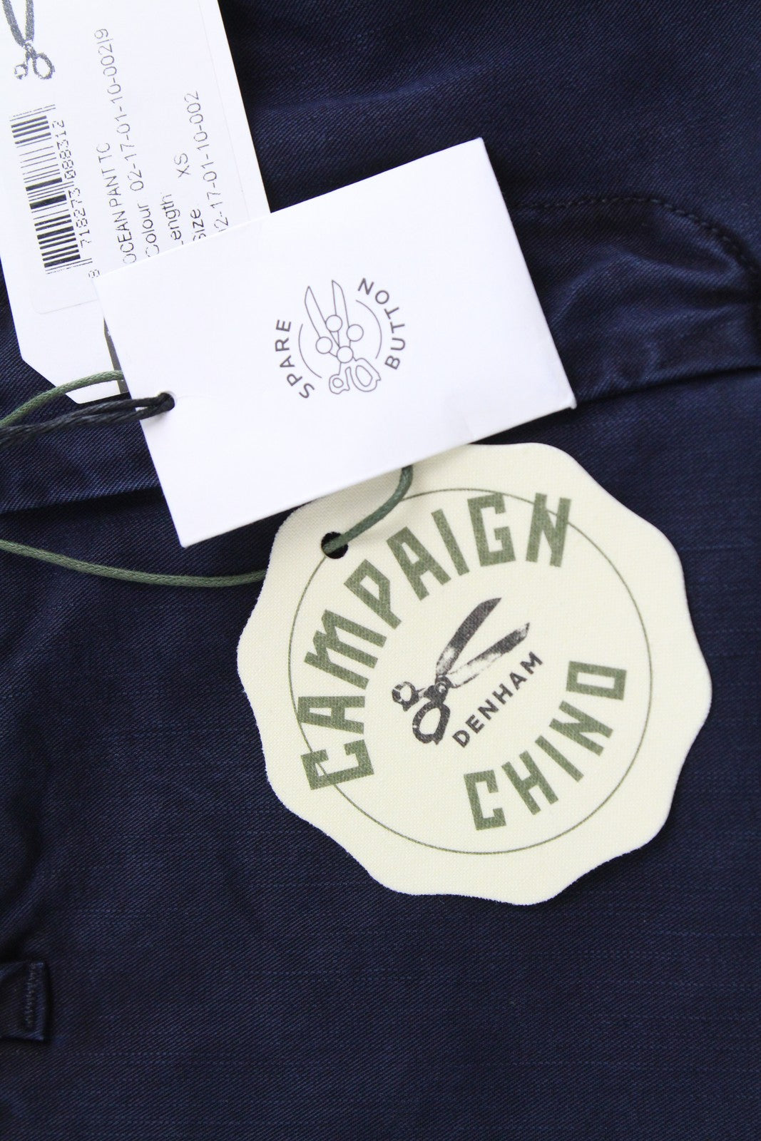 DENHAM Ocean moteriškos XS dydžio tamsiai mėlynos medvilnės mišinio laisvalaikio chino stiliaus klostuotos kelnės priekyje