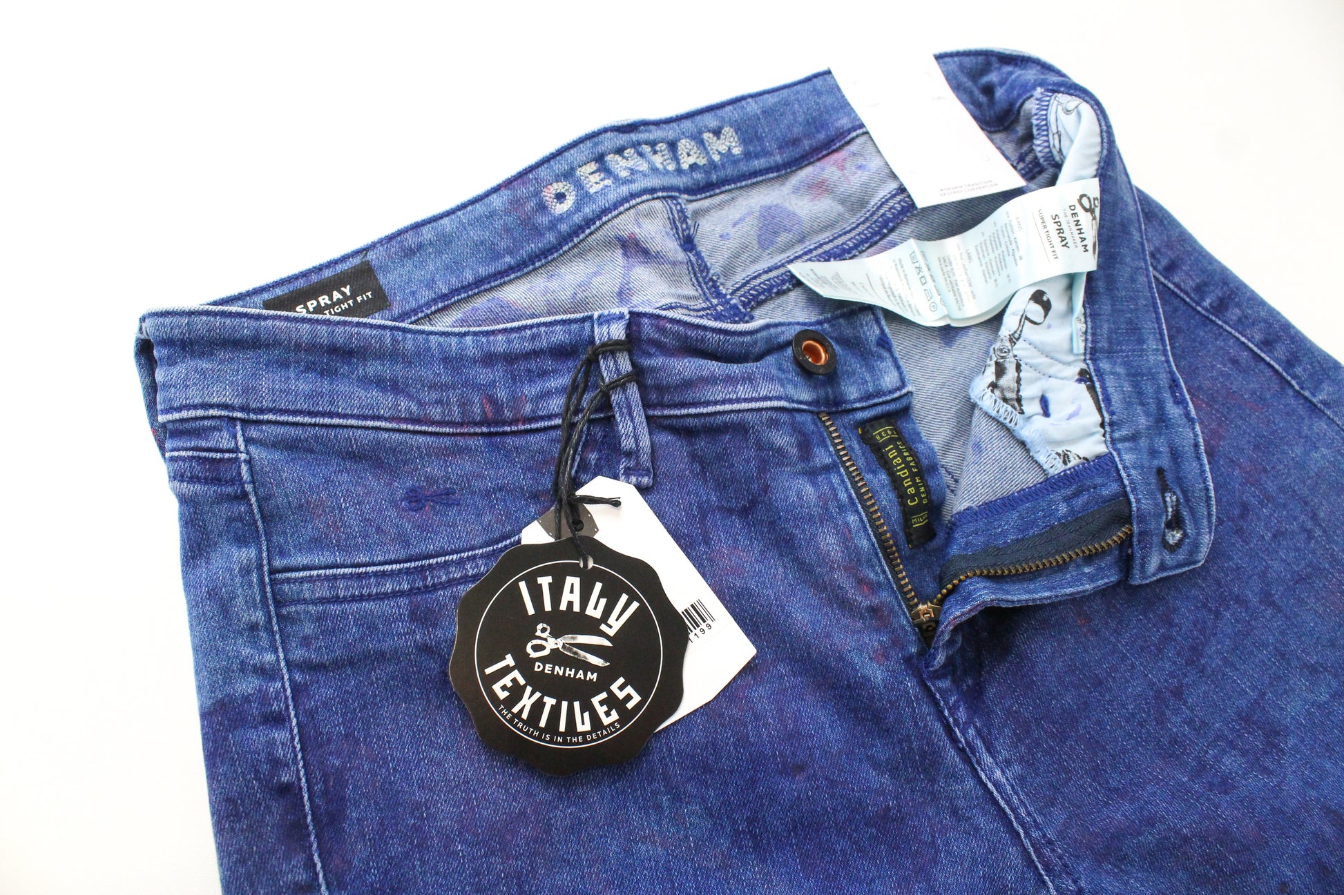 DENHAM Spray W28/L32 moteriškos tamprios mėlynos džinsinės kelnės, skalbtos, itin aptemptos