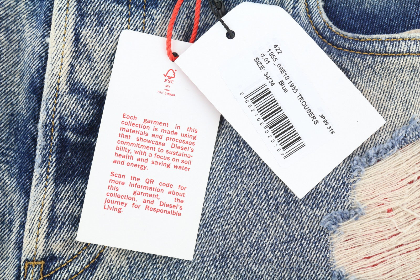 DIESEL 1955 09E10 vyriški džinsai, W34/L34, mėlyni, tiesaus kirpimo, su gobtuvu, RRP 375 USD.