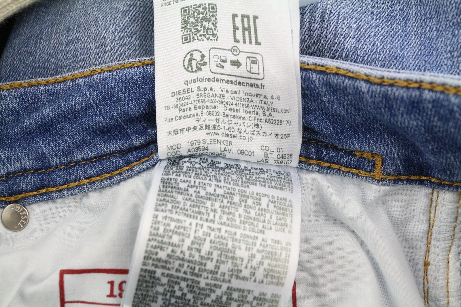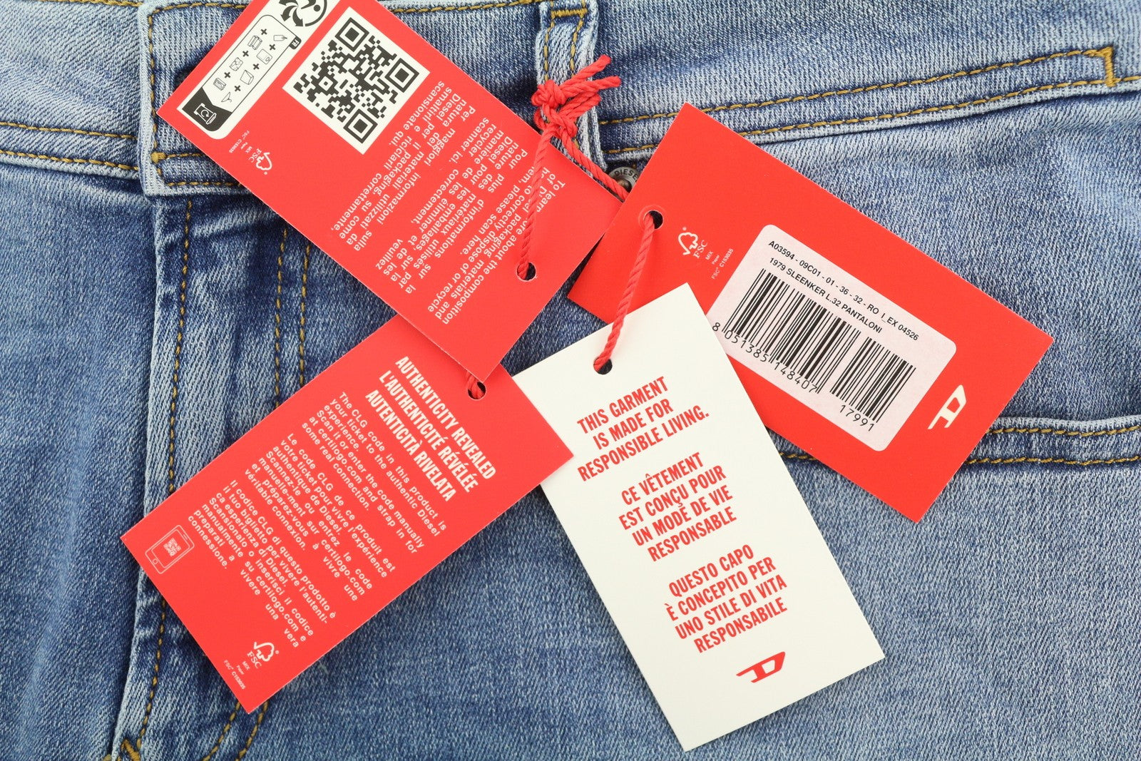 DIESEL 1979 Sleenker 09C01 vyriški džinsai W36/L32 žemo juosmens, aptempti, mėlyni, rekomenduojama kaina – 195 €