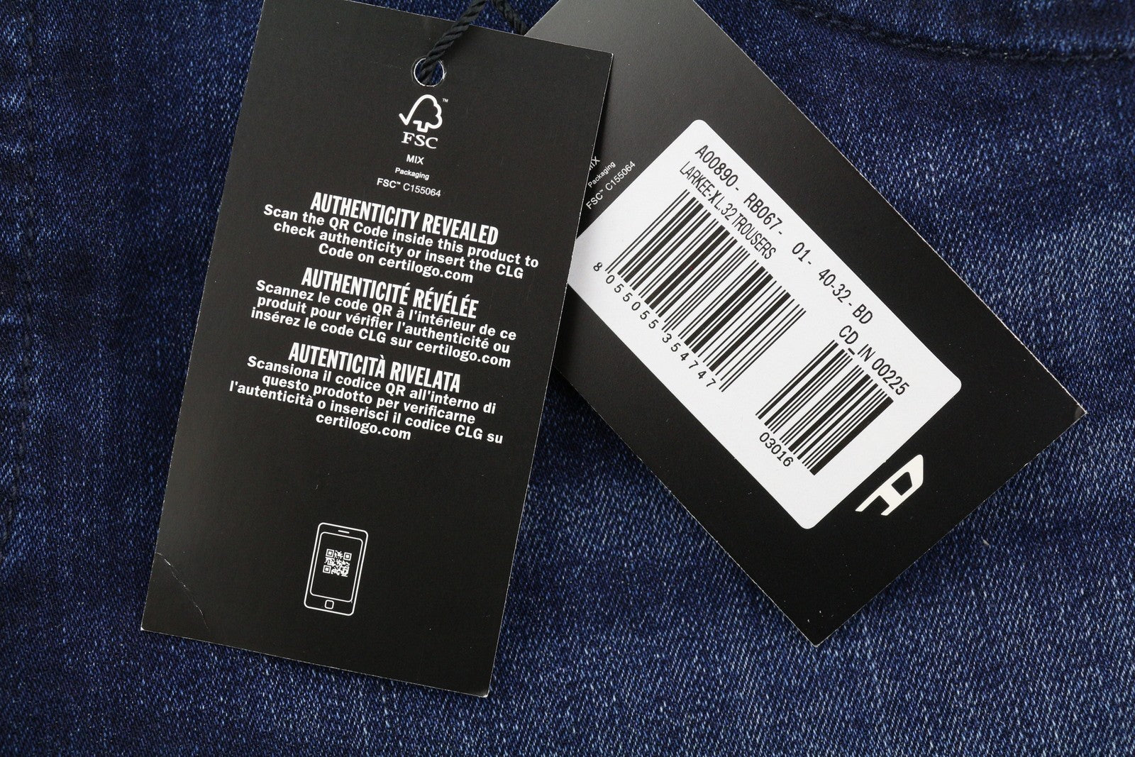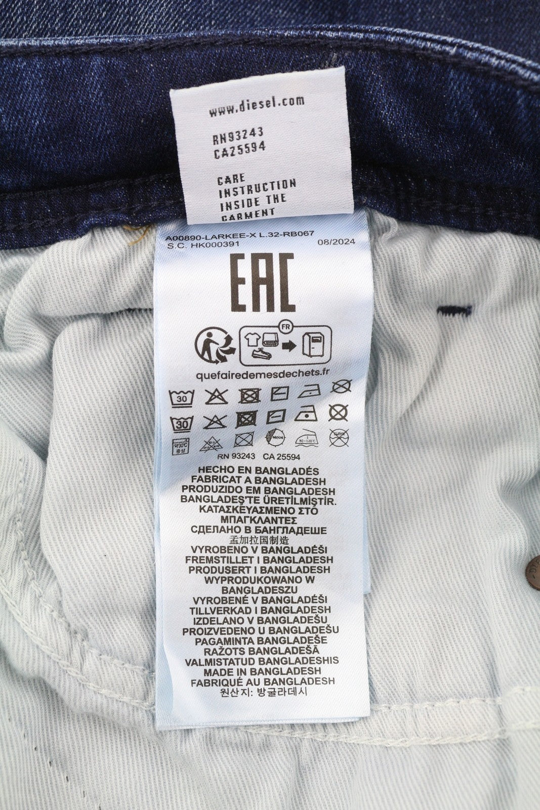DIESEL 1985 Larkee RB067 vyriški džinsai, W40/L32, tiesaus kirpimo, su sagomis, skalbtos mėlynos spalvos.