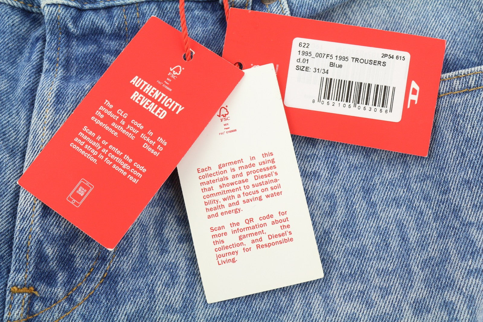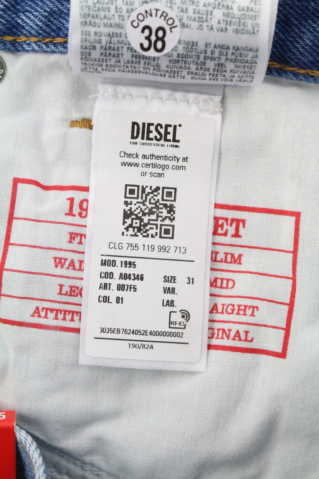 DIESEL 1995 007F5 vyriški džinsai W31/L34, prigludę, tiesaus kirpimo, raštuoti, rekomenduojama mažmeninė kaina – 250 €