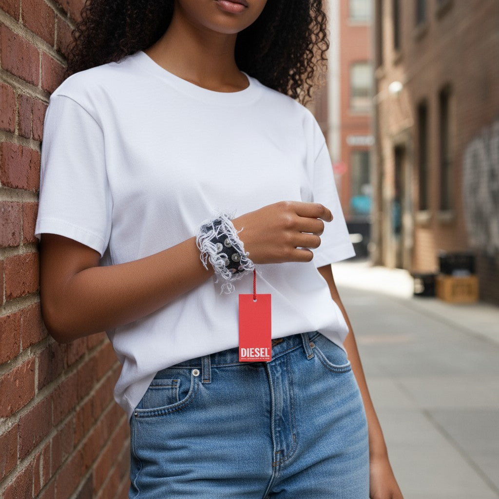 DIESEL A-Vets C moteriška apyrankė OS juoda džinsinio audinio siūlai sidabro atspalvis RRP 90 €