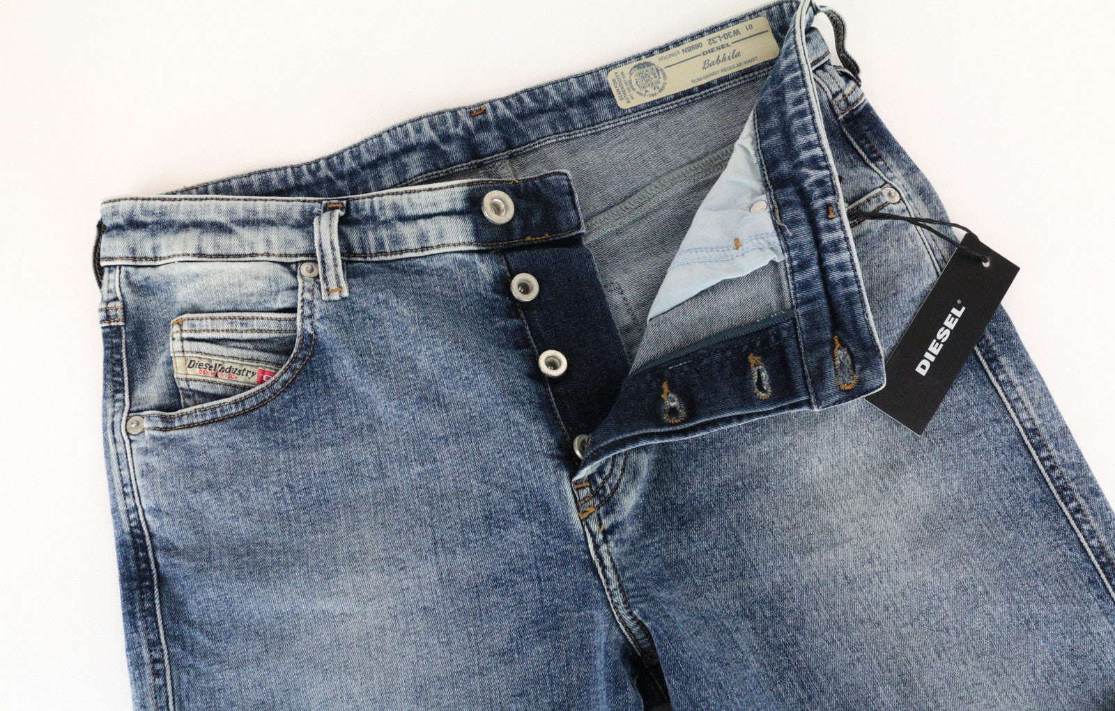 DIESEL Babhila 069BN moteriški aptempti džinsai W30/L32 išblukintos mėlynos spalvos ploni tamprūs džinsai su sagomis
