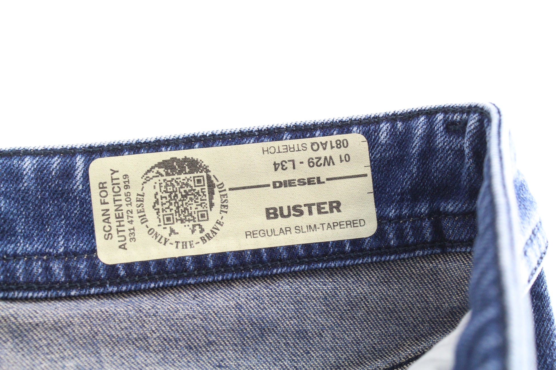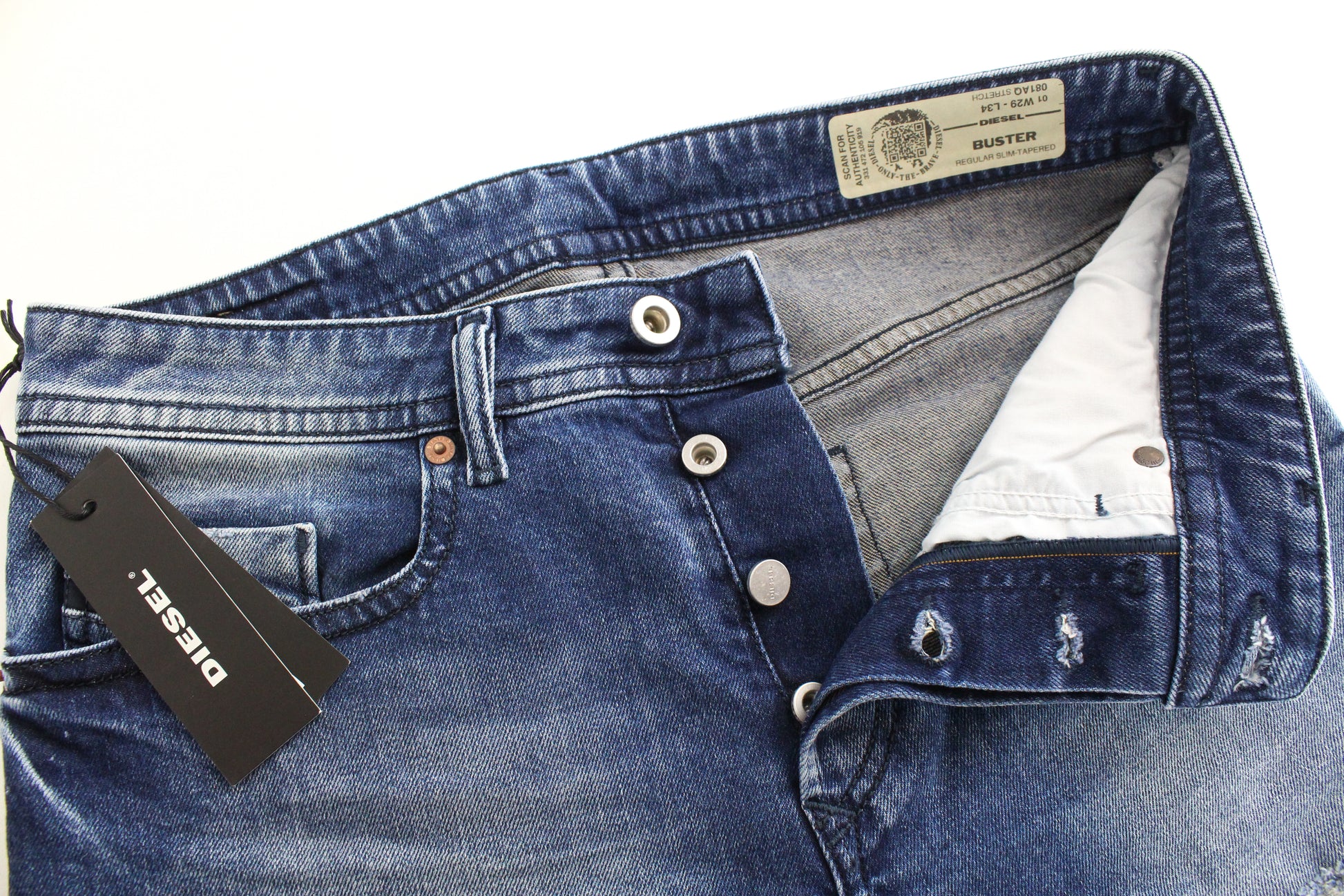 DIESEL Buster 081AQ vyriški džinsai W29 L34 mėlyni, siaurėjantys, ploni, tamprūs.