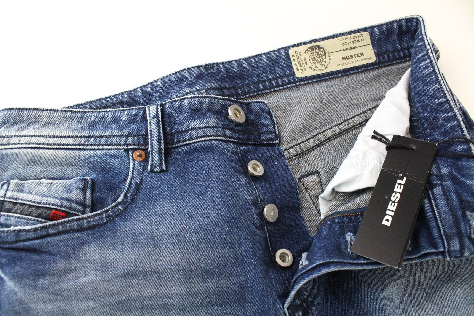 DIESEL Buster 081AQ vyriški mėlyni, siaurėjantys, plėšyti medvilniniai tamprūs džinsai W28/L32