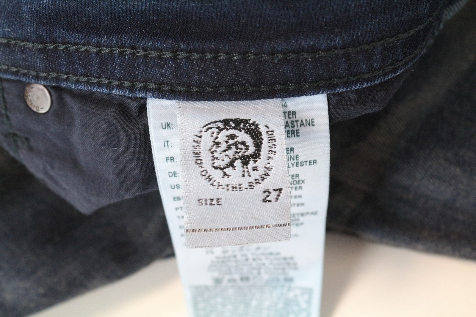 DIESEL Buster R78U6 mėlyni W27 L30 ploni, siaurėjantys vyriški džinsai su išblukusiu raštu.