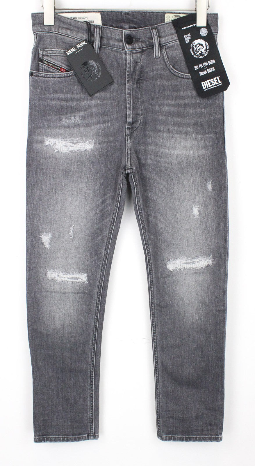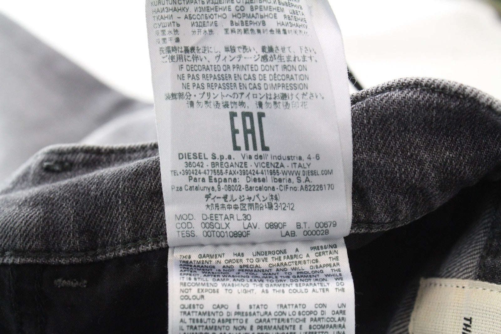 DIESEL D-Eetar 0890F vyriški W28/L30 džinsai su plėšytomis juostelėmis, pilki, tamprūs, siaurėjantys medvilniniai džinsai