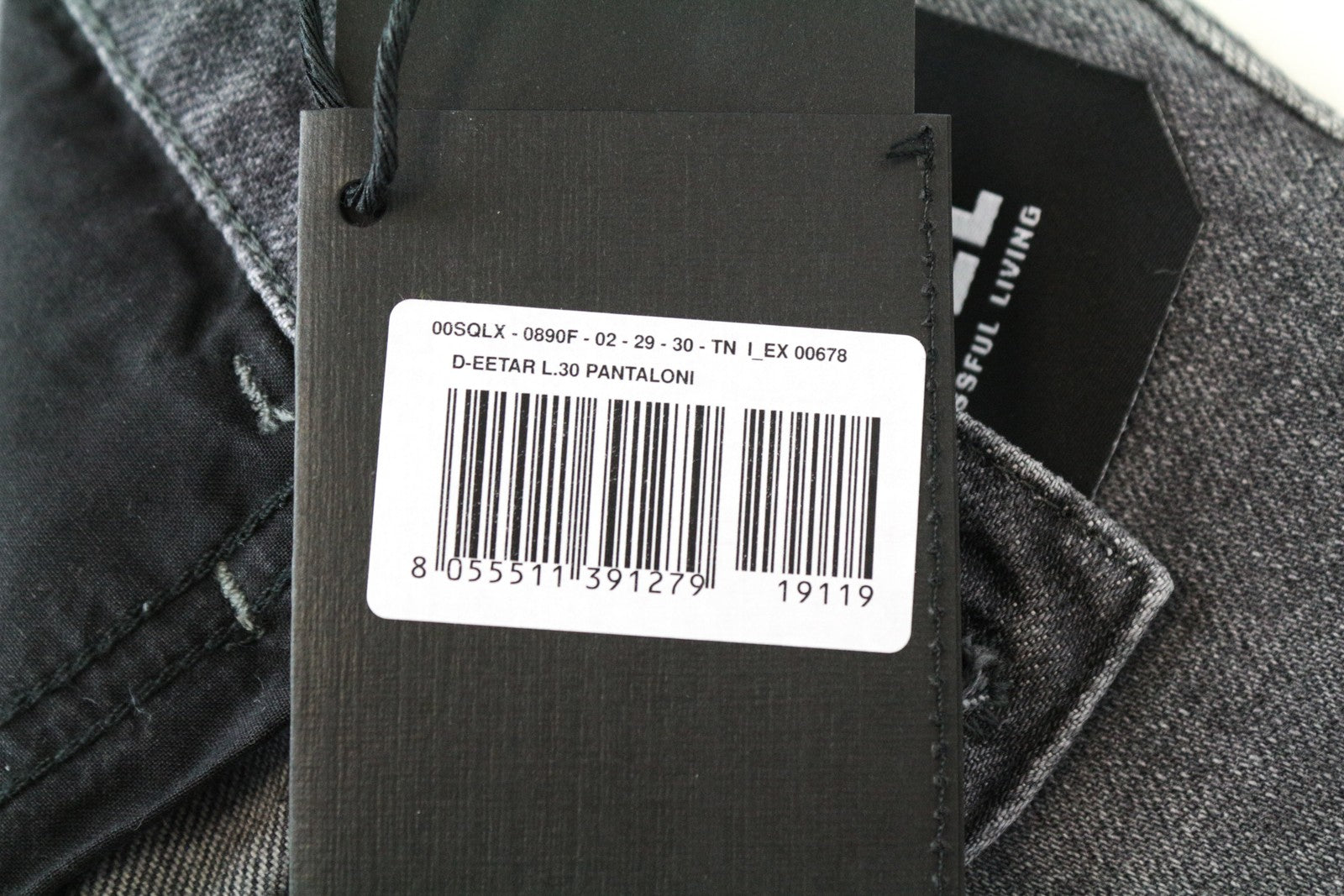 DIESEL D-Eetar 0890F W29/L30 skalbti plėšyti pilki siaurėjantys džinsai iš tamprios medvilnės vyrams