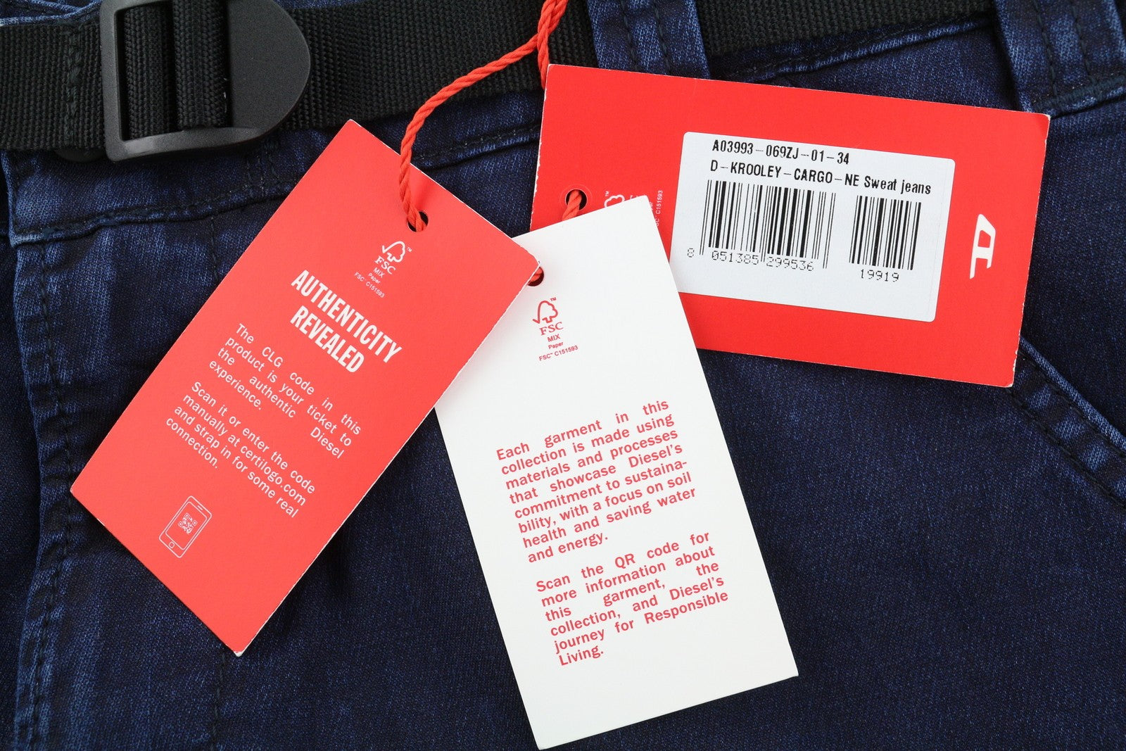 DIESEL D-Krooley-Cargo-Ne 069ZJ vyriški džinsai W34 su juosmeniu, siaurėjančiomis klešnėmis, rekomenduojama kaina – 295 €, mėlyni