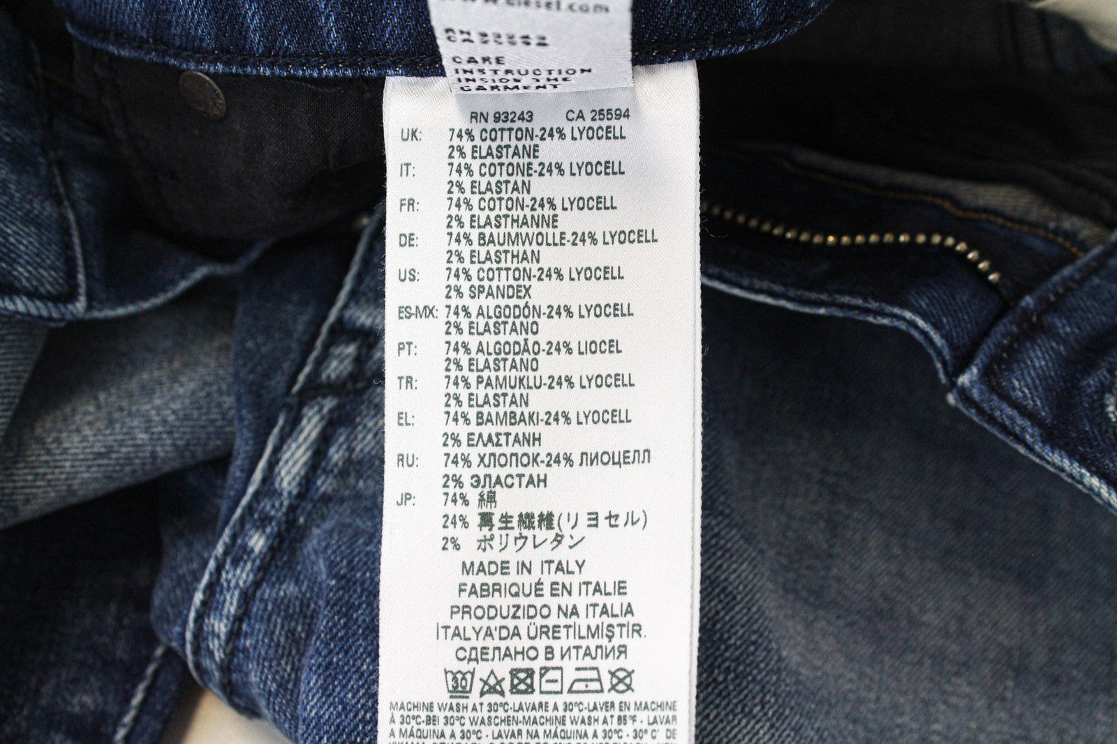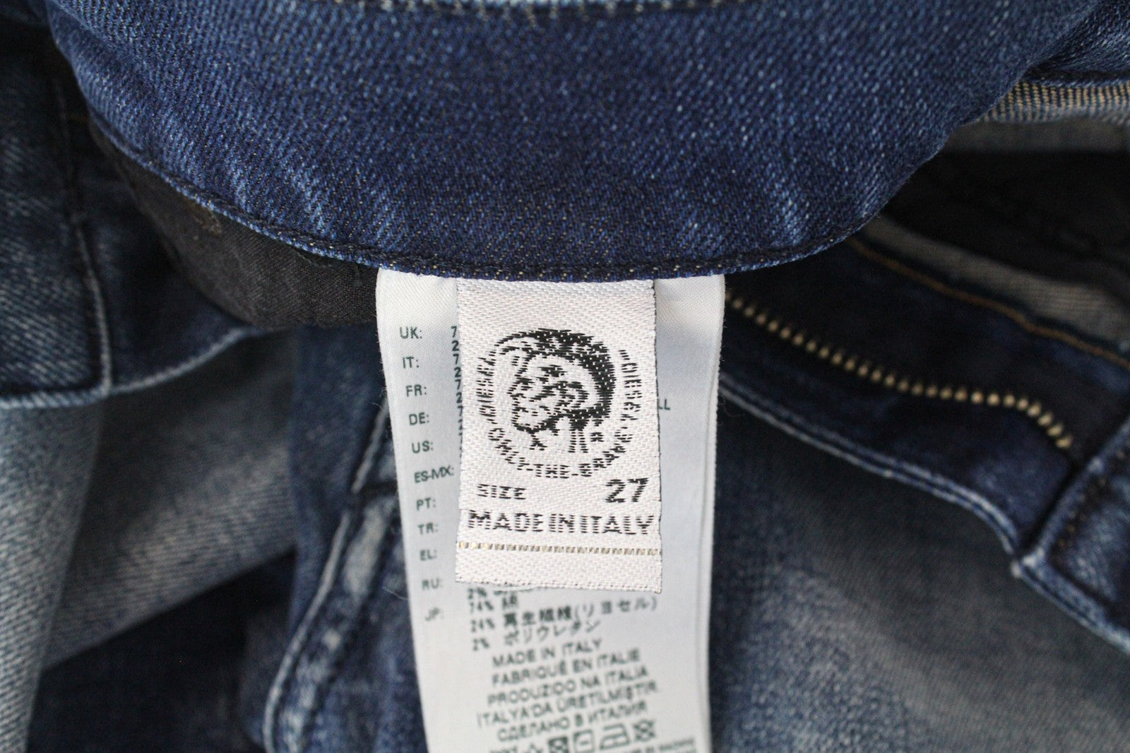 DIESEL D-Strukt 081AQ vyriški W27/L32 siaurėjantys mėlyni tamprūs džinsai su apgadintu kirpimu
