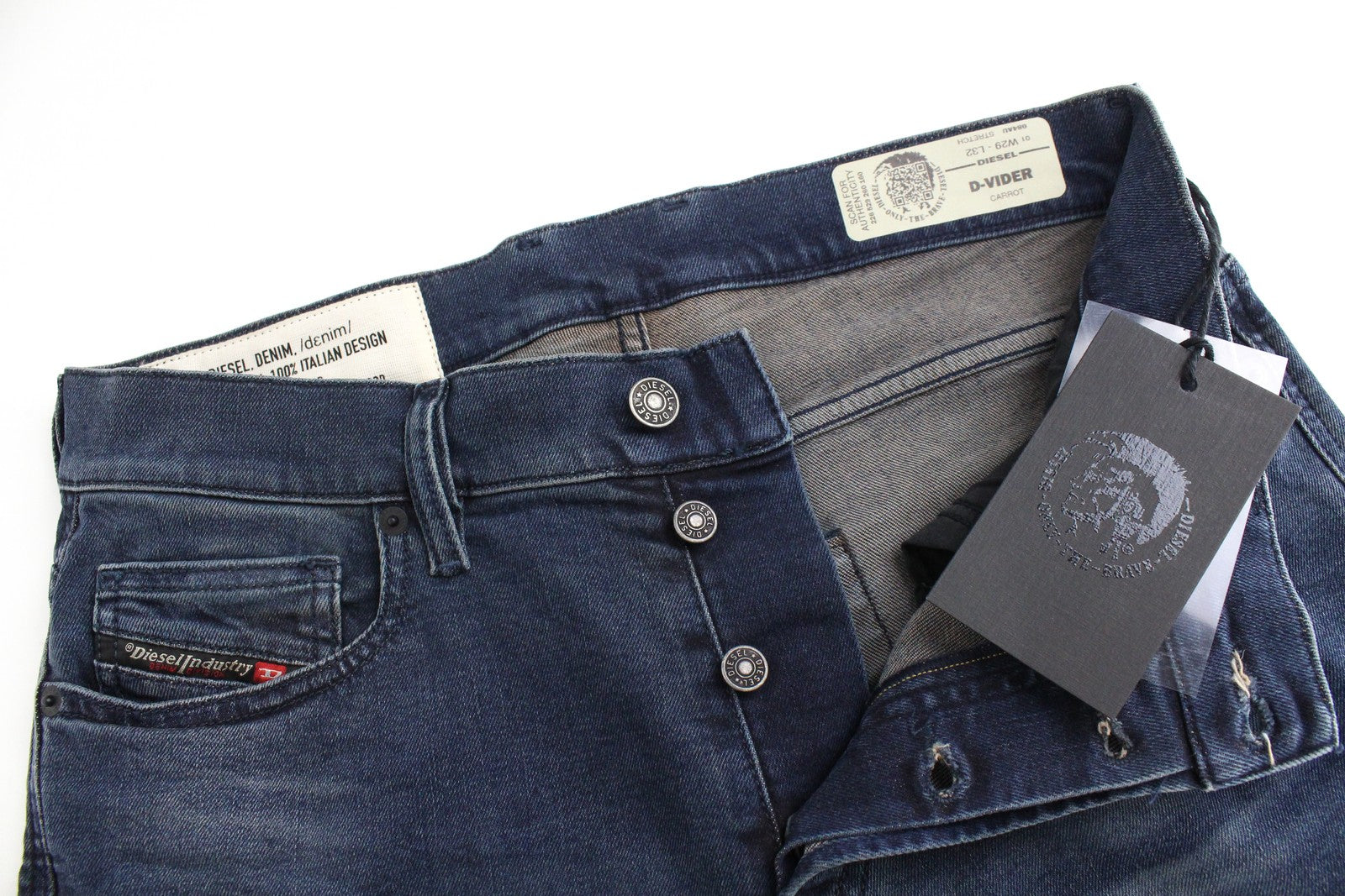 DIESEL D-Vider 084AU vyriški džinsai W29/L32 morkų kirpimo tamprūs mėlyni skalbti džinsai