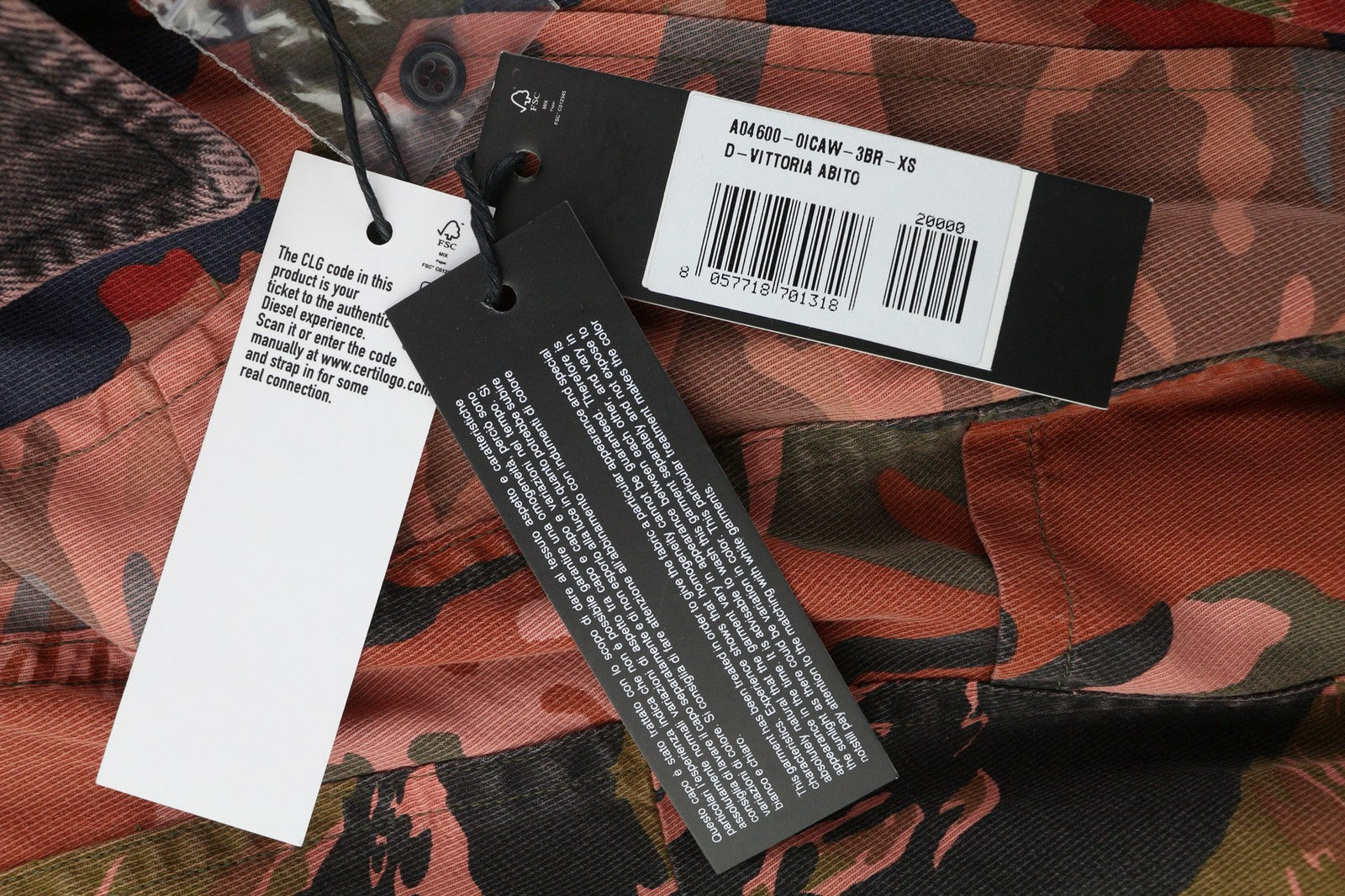 DIESEL D-Vittoria moteriška suknelė XS dydžio ilgomis rankovėmis, su diržu, kamufliažinė nugara, rekomenduojama kaina – 350 €