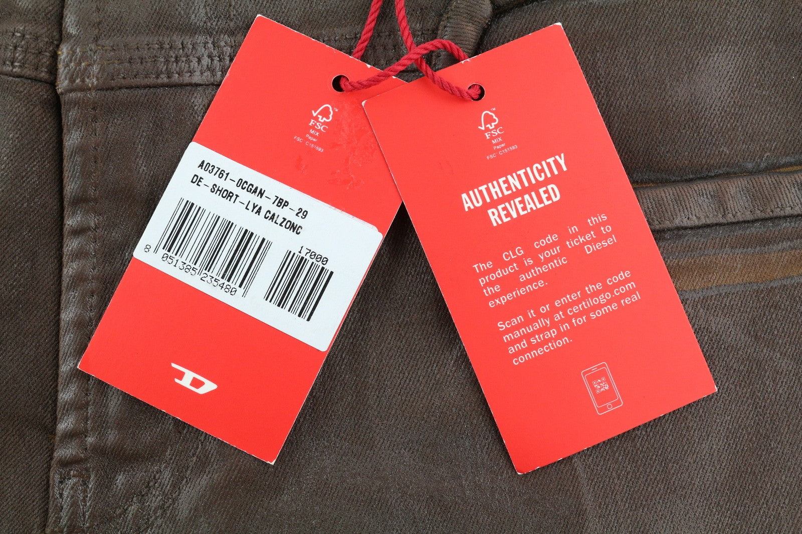 DIESEL De-Short-Lya 0CGAN moteriški šortai W29 rudi, dengti blizgančiu džinsu, rekomenduojama kaina – 295 €