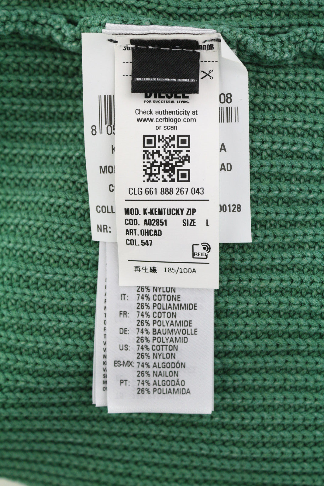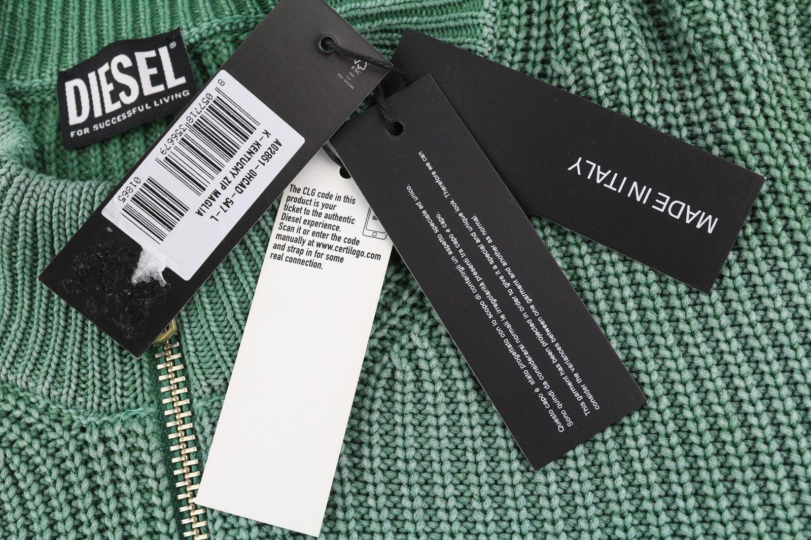 DIESEL K-Kentucky vyriškas megztinis su užtrauktuku, L dydžio, su skalbto efekto apvalia kaklo iškirpte, megztas žalias, rekomenduojama kaina – 250 €