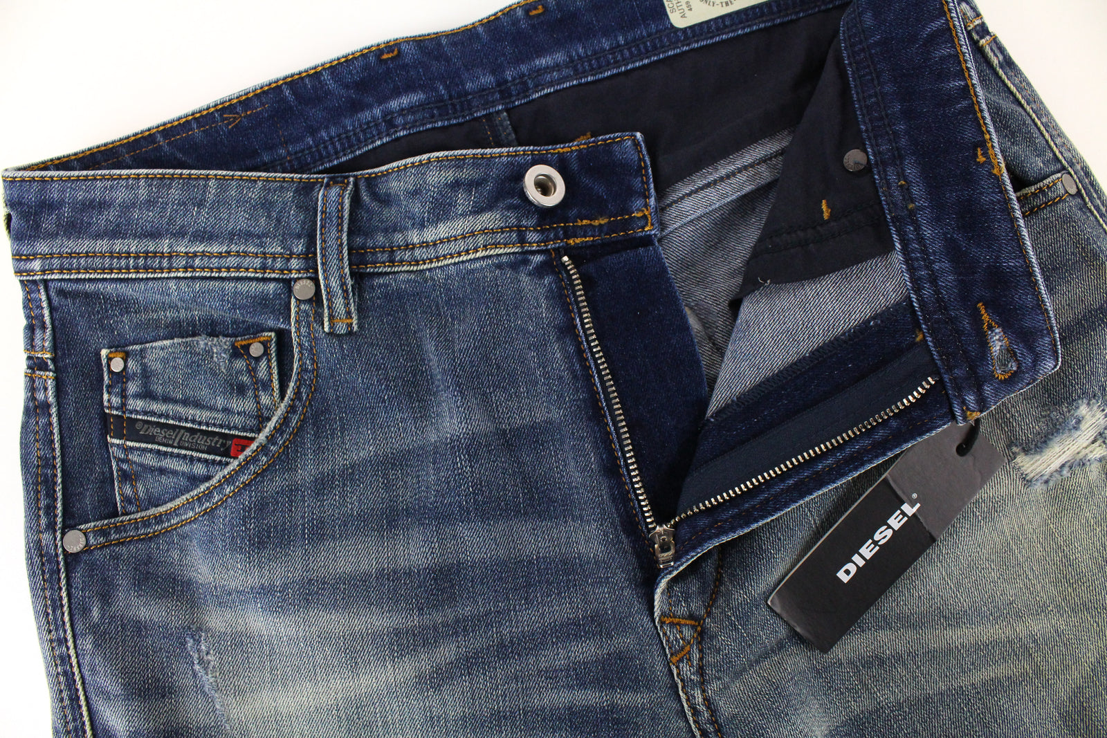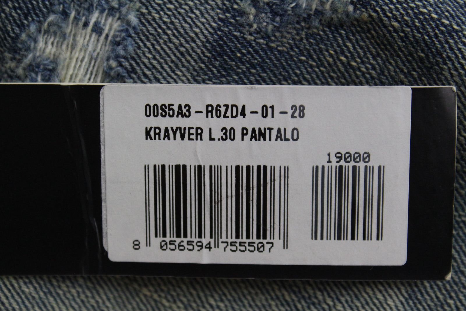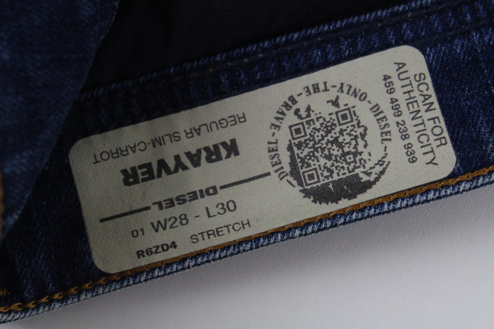 DIESEL Krayver R6ZD4 vyriški mėlyni džinsai W28/L30 Slim morkų rašto plėšytos medvilnės tamprės