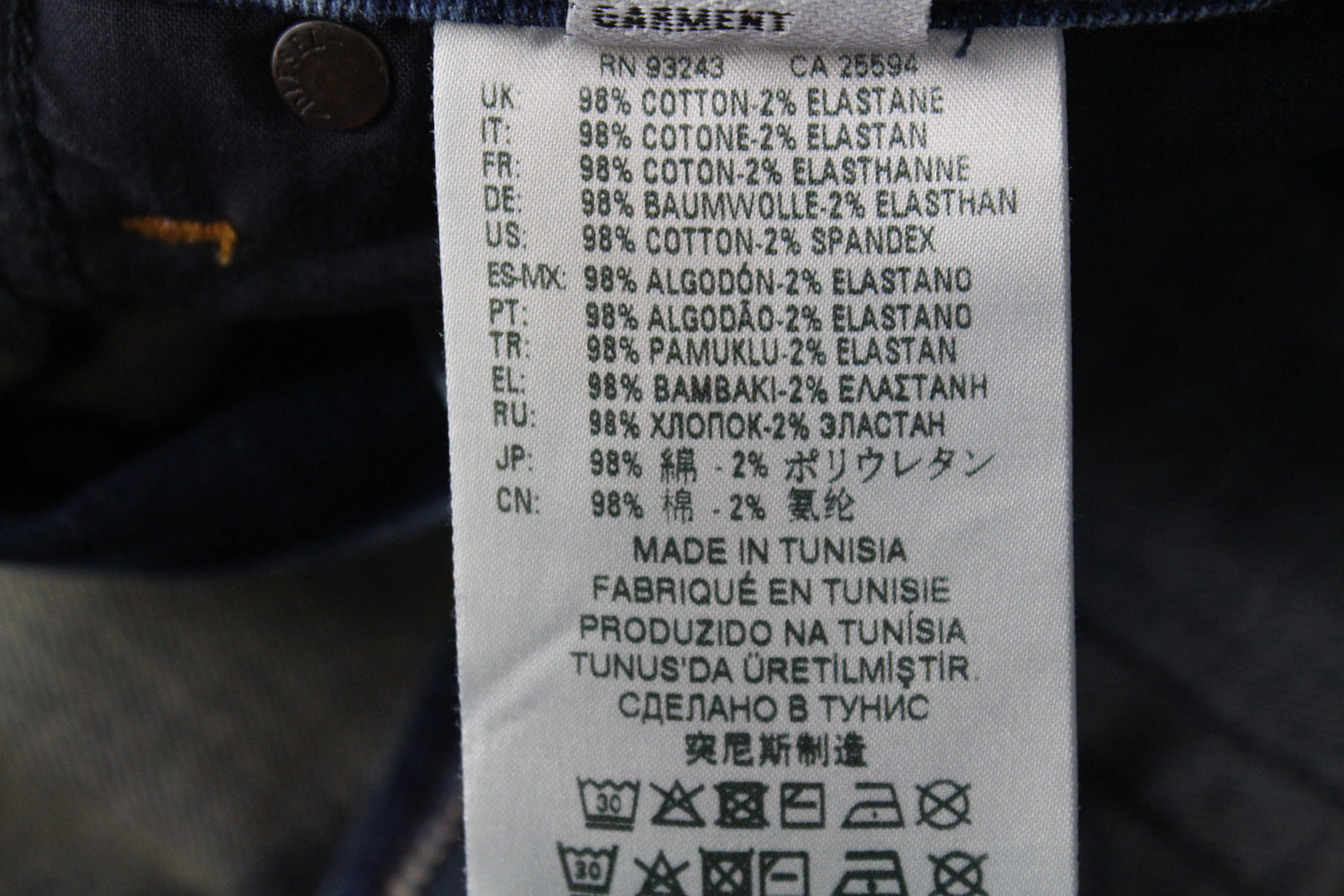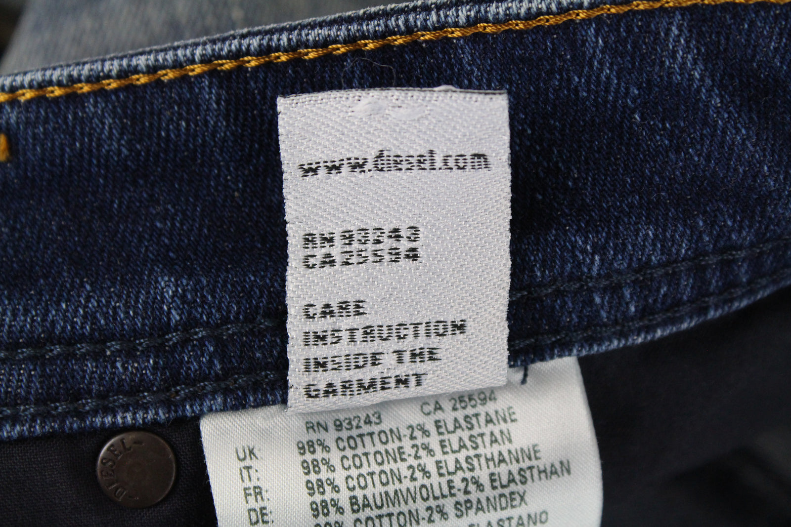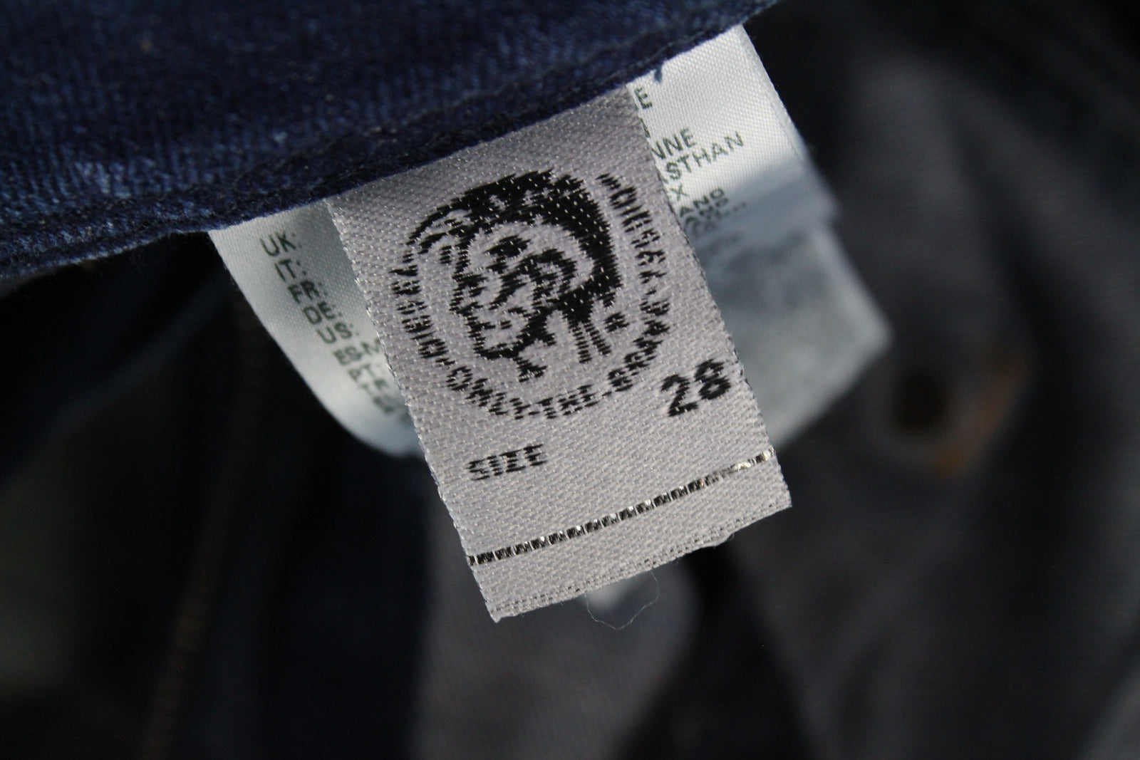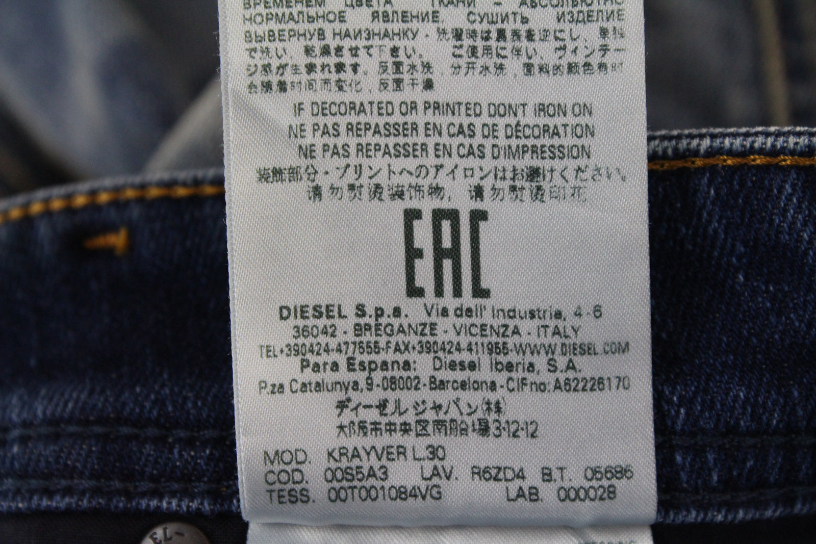 DIESEL Krayver R6ZD4 vyriški mėlyni džinsai W28/L30 Slim morkų rašto plėšytos medvilnės tamprės