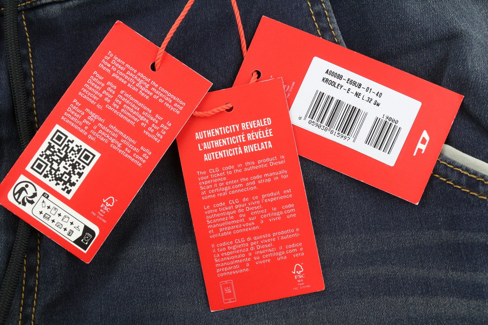 DIESEL Krooley Jogg E69UB vyriški džinsai W40/L32 tamprūs, siaurėjantys, skalbtos mėlynos spalvos, rekomenduojama kaina – 295 €