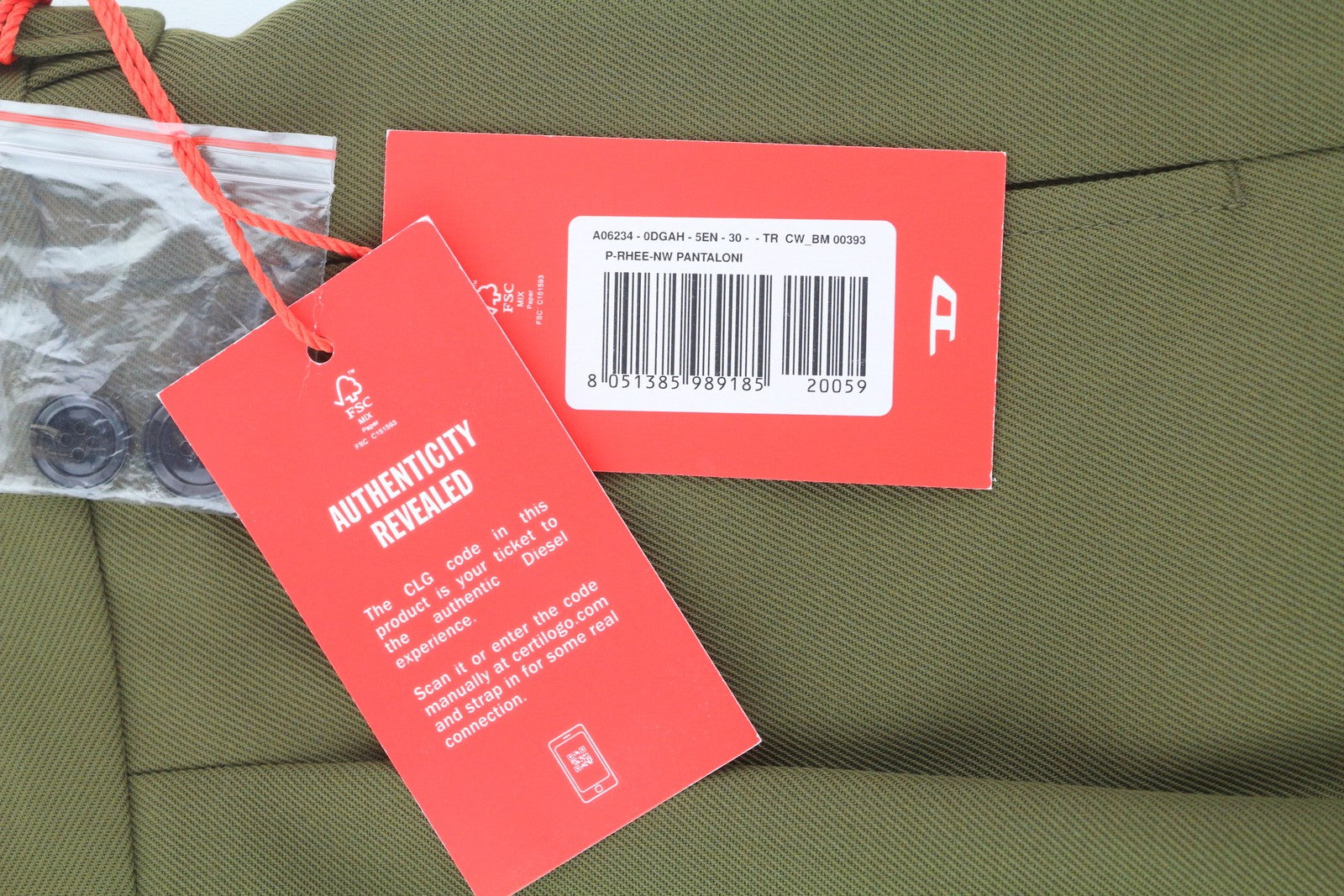 DIESEL P-Rhee-Nw vyriškos kelnės W30 žalios vilnos mišinio su klostėmis ir užtrauktuku, rekomenduojama mažmeninė kaina – 283 €