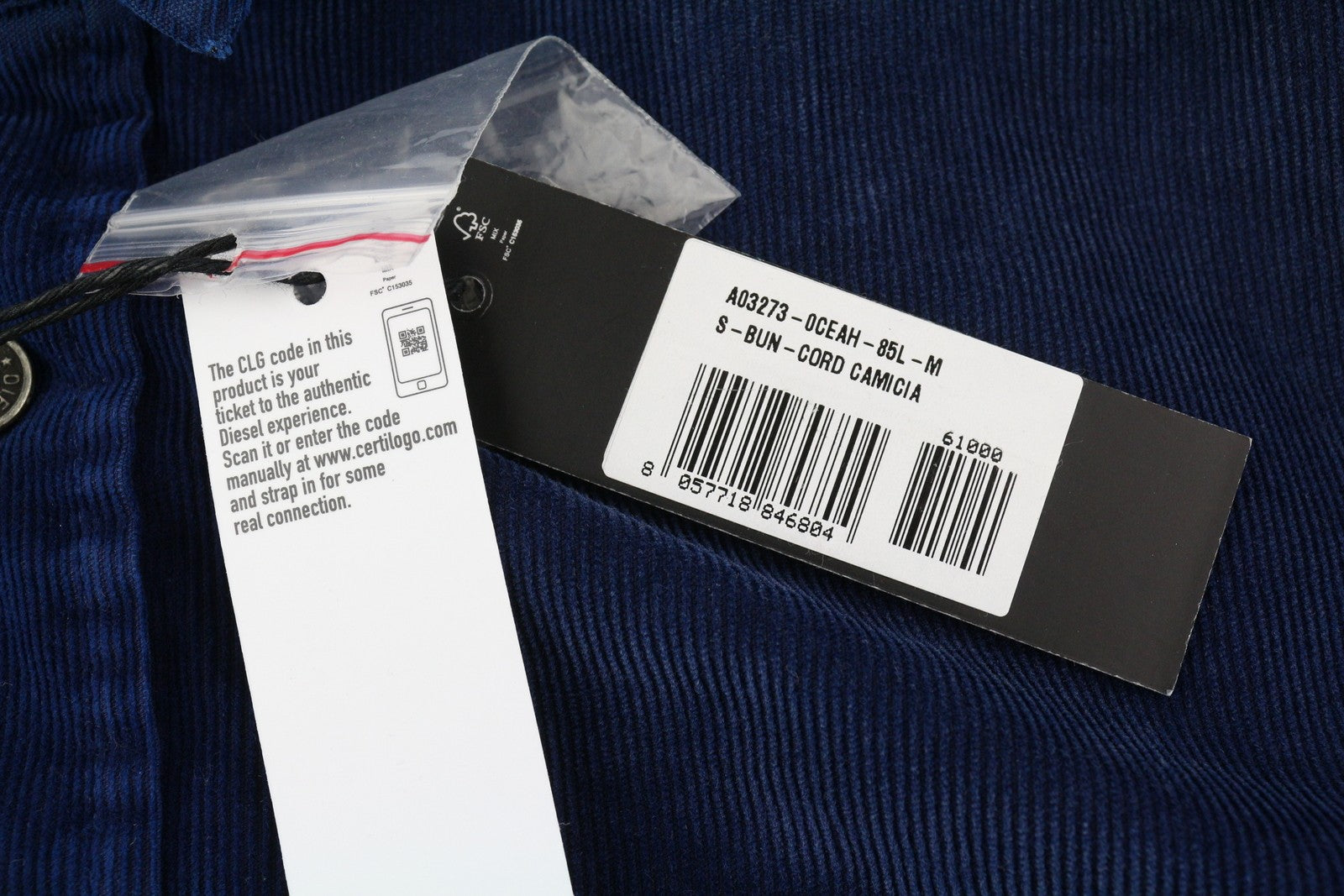 DIESEL vyriški marškinėliai S-Bun-Cord, M dydžio, skalbtos mėlynos spalvos, storai išskleidžiamos sagties. Rekomenduojama kaina – 175 €.