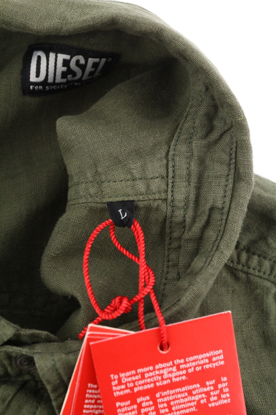 DIESEL S-East-Long-Lin vyriški marškinėliai L dydžio, alyvuogių žali, lininiai, išskleidžiama apykaklė, rekomenduojama kaina – 175 €