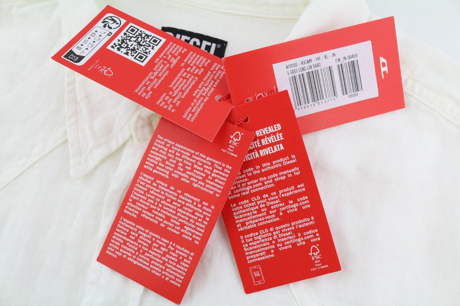 DIESEL S-East-Long-Lin vyriški marškiniai, XL dydžio, lininiai, su sagomis, platėjančia apykakle. Rekomenduojama kaina – 175 €.