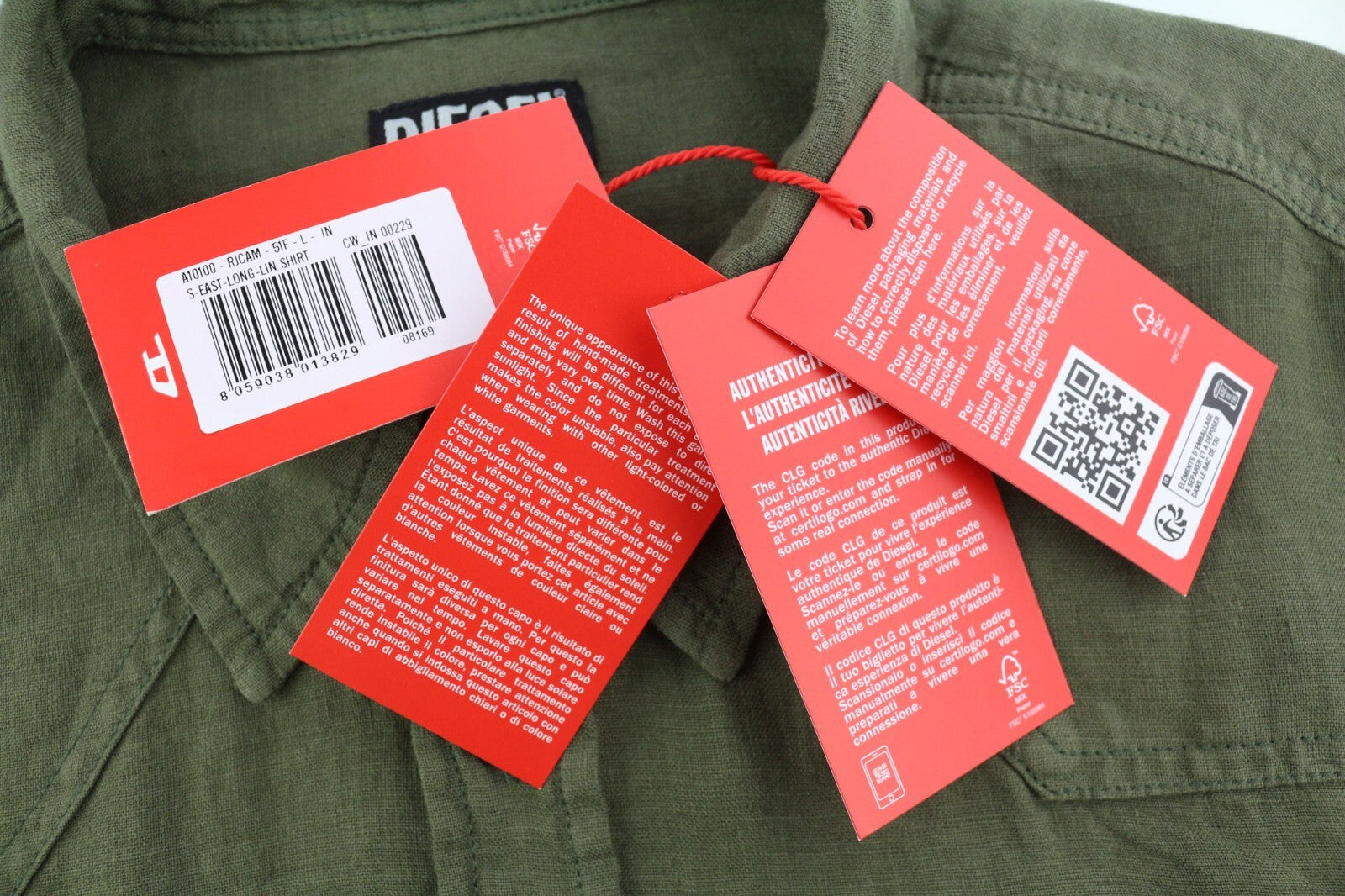 DIESEL S-East-Long-Lin vyriški alyvuogių žali lininiai marškinėliai išplatinta kaklo iškirpte. Rekomenduojama kaina – 175 €.