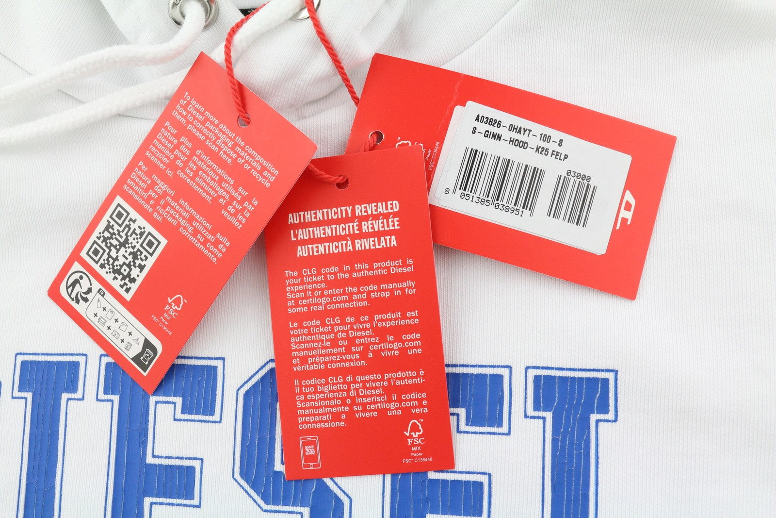 DIESEL S-Ginn-Hood-K25 vyriškas džemperis su gobtuvu S dydžio, baltas, su kengūros kišene. Rekomenduojama kaina – 125 €.