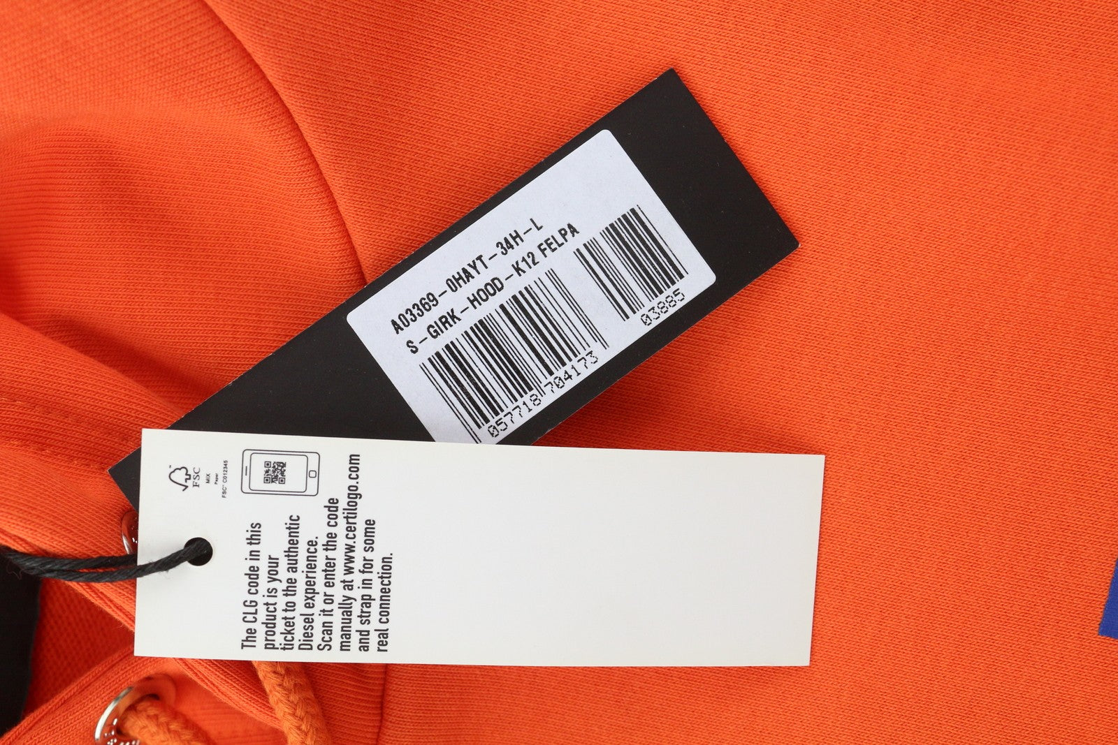 DIESEL S-Girk-Hood-K12 vyriškas džemperis su gobtuvu L dydžio, oranžinis, su kengūros kišene. RMK 130 €.