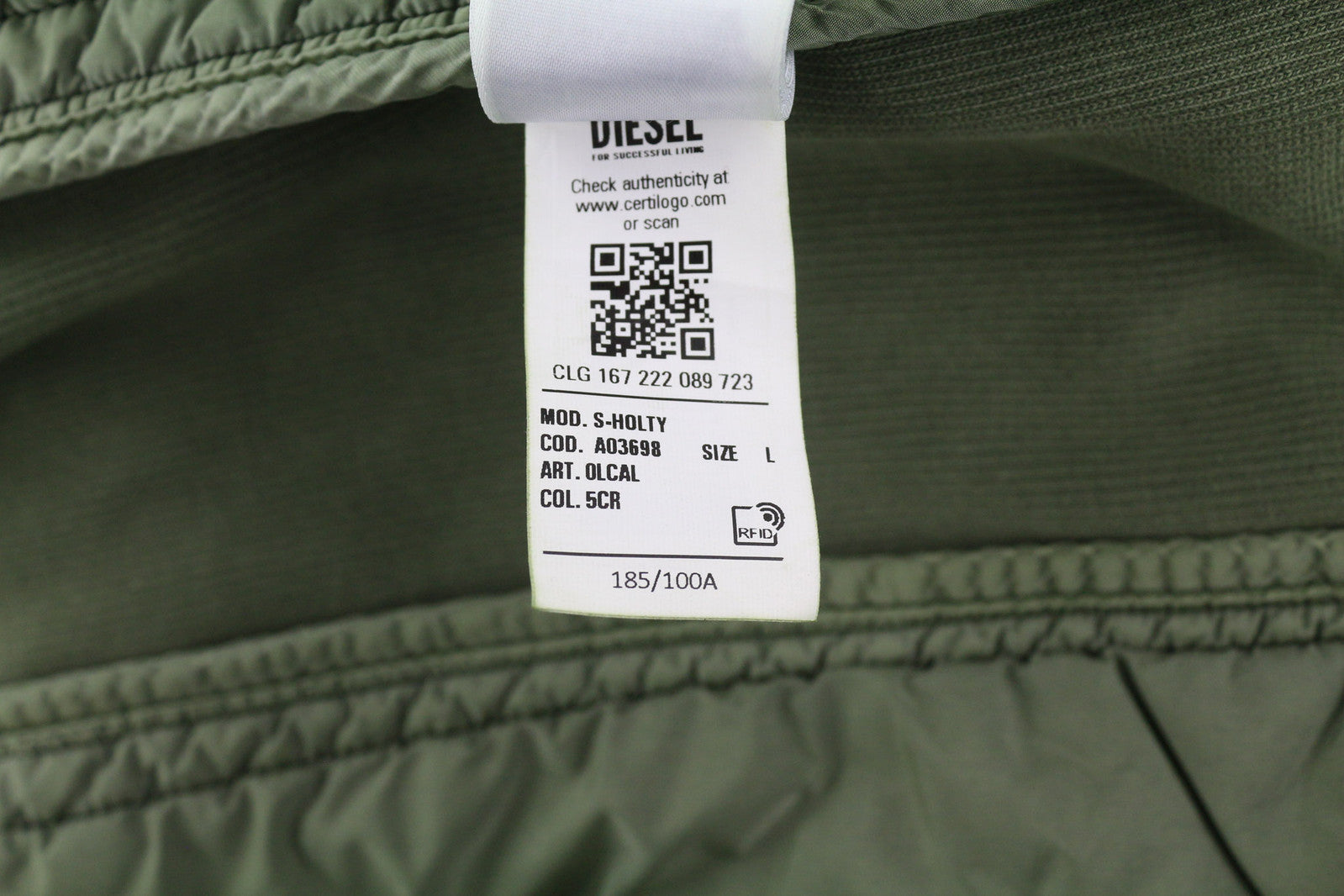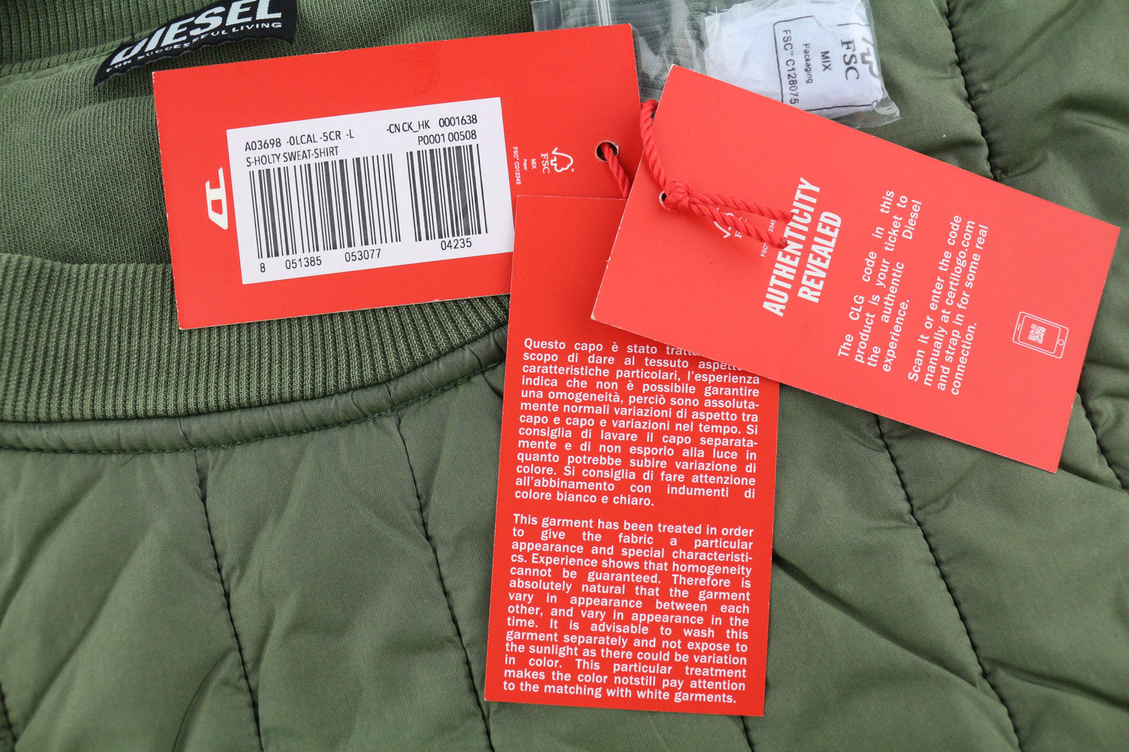 DIESEL S-Holty vyriškas džemperis, L dydžio, žalias, megztinis su paminkštinimu, dygsniuota apvalia kaklo apykakle, rekomenduojama kaina – 225 €