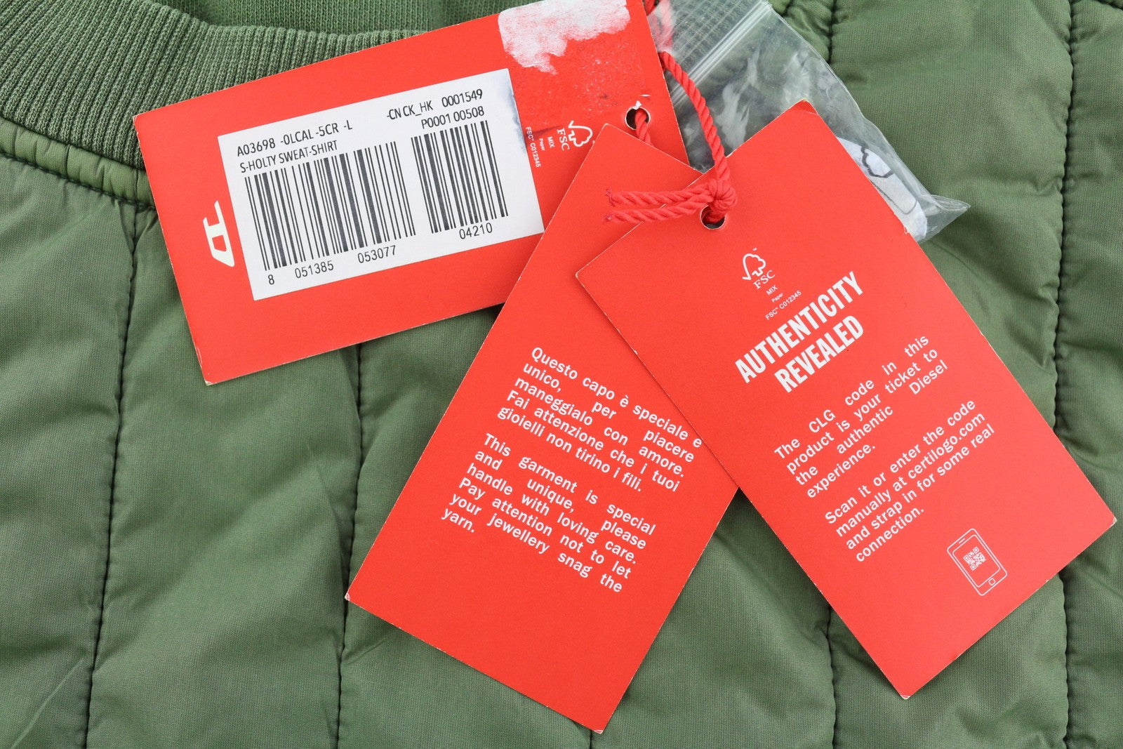 DIESEL S-Holty vyriškas L dydžio chaki spalvos megztinis su apvalia kaklo dalimi, paminkštinta, dygsniuota... RMK 225 €