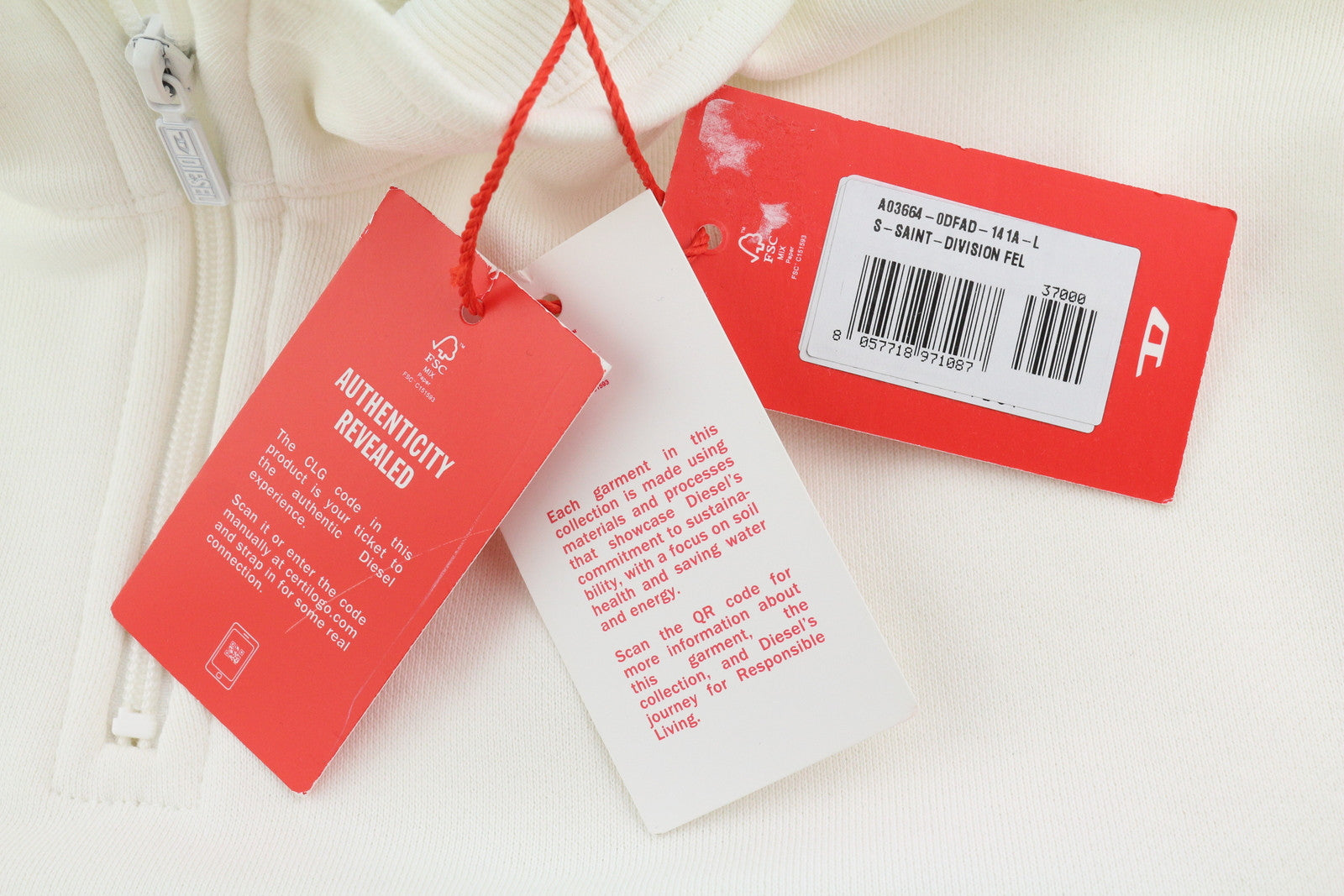 DIESEL S-Saint-Division vyriškas džemperis, L, baltas, su puse užtrauktuko apykaklės, rekomenduojama kaina – 225 €