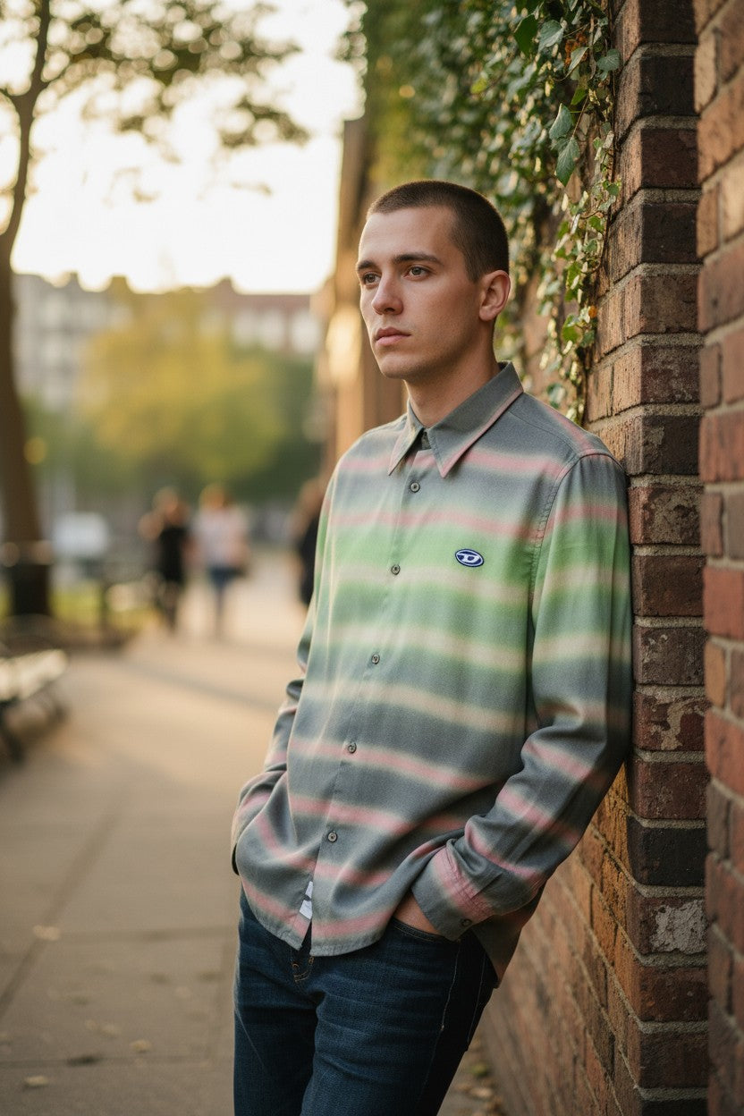DIESEL vyriški marškinėliai S-Tucker dryžiais, L, rekomenduojama kaina 150 €, raštuotas, sagomis užsegamas, išskleidžiamas logotipas, šviesus