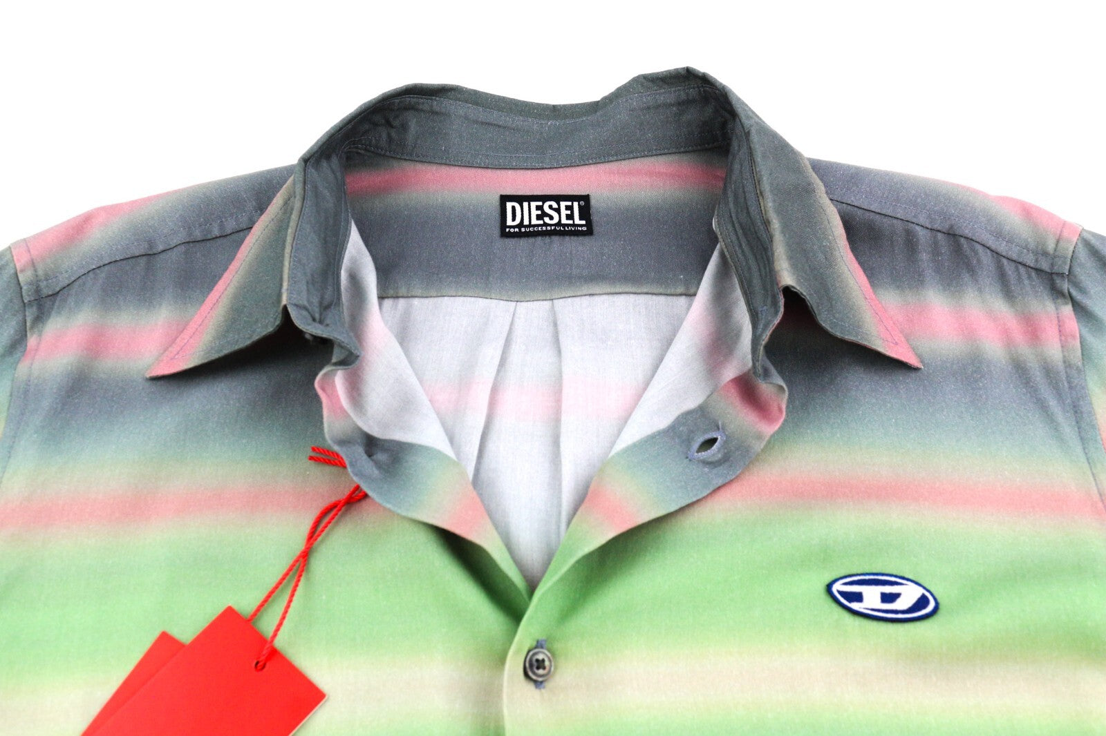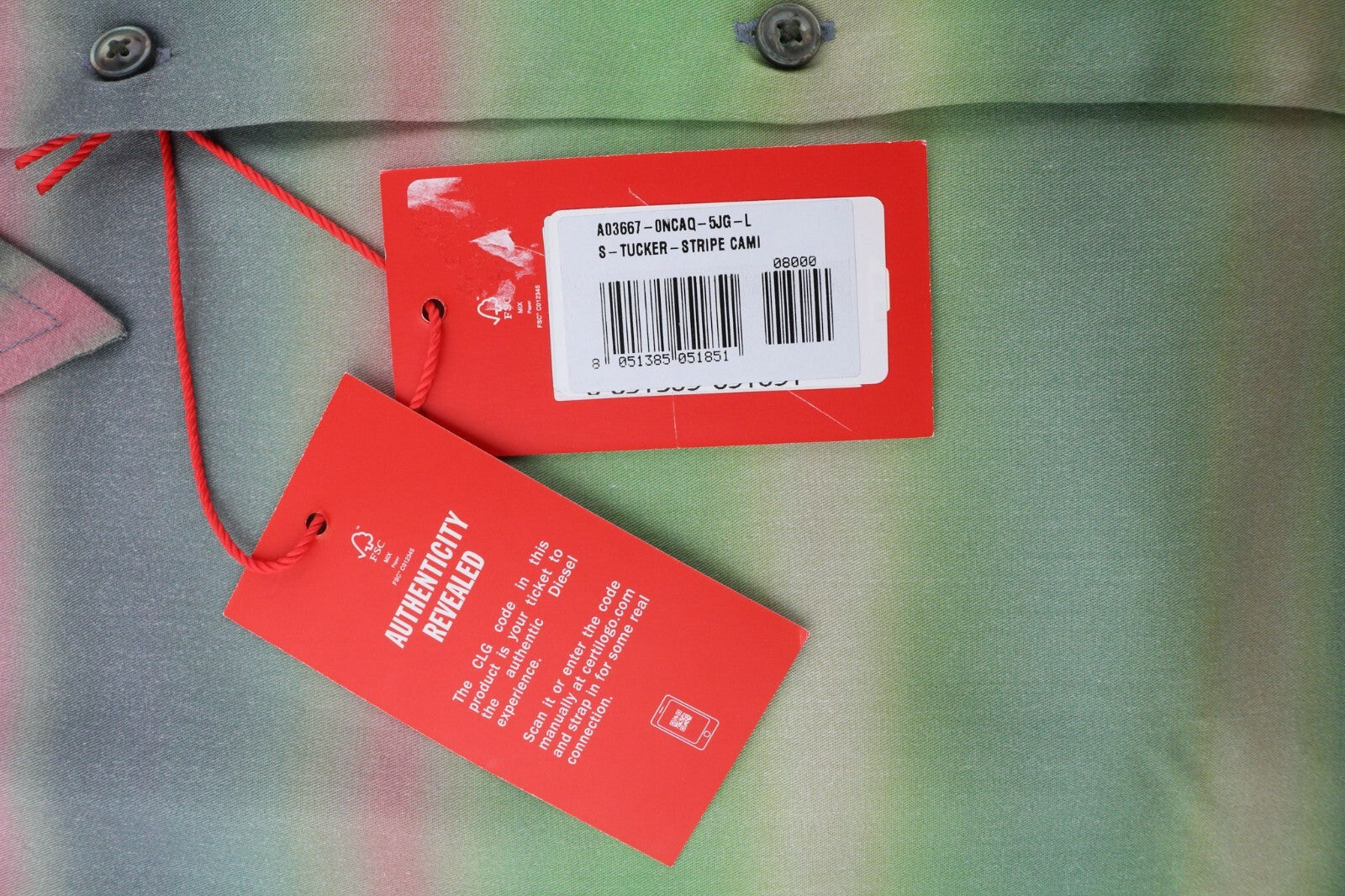 DIESEL vyriški marškinėliai S-Tucker dryžiais, L dydžio, rekomenduojama kaina 150 €, raštuoti sagomis užsegami, išskleidžiama apykaklė.