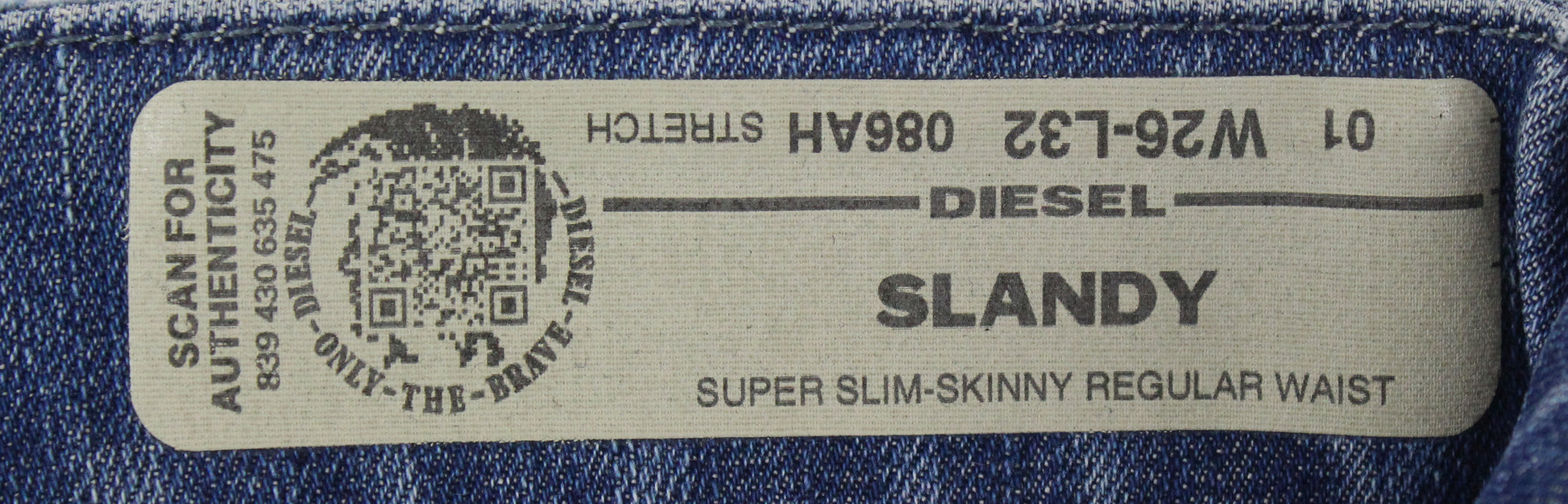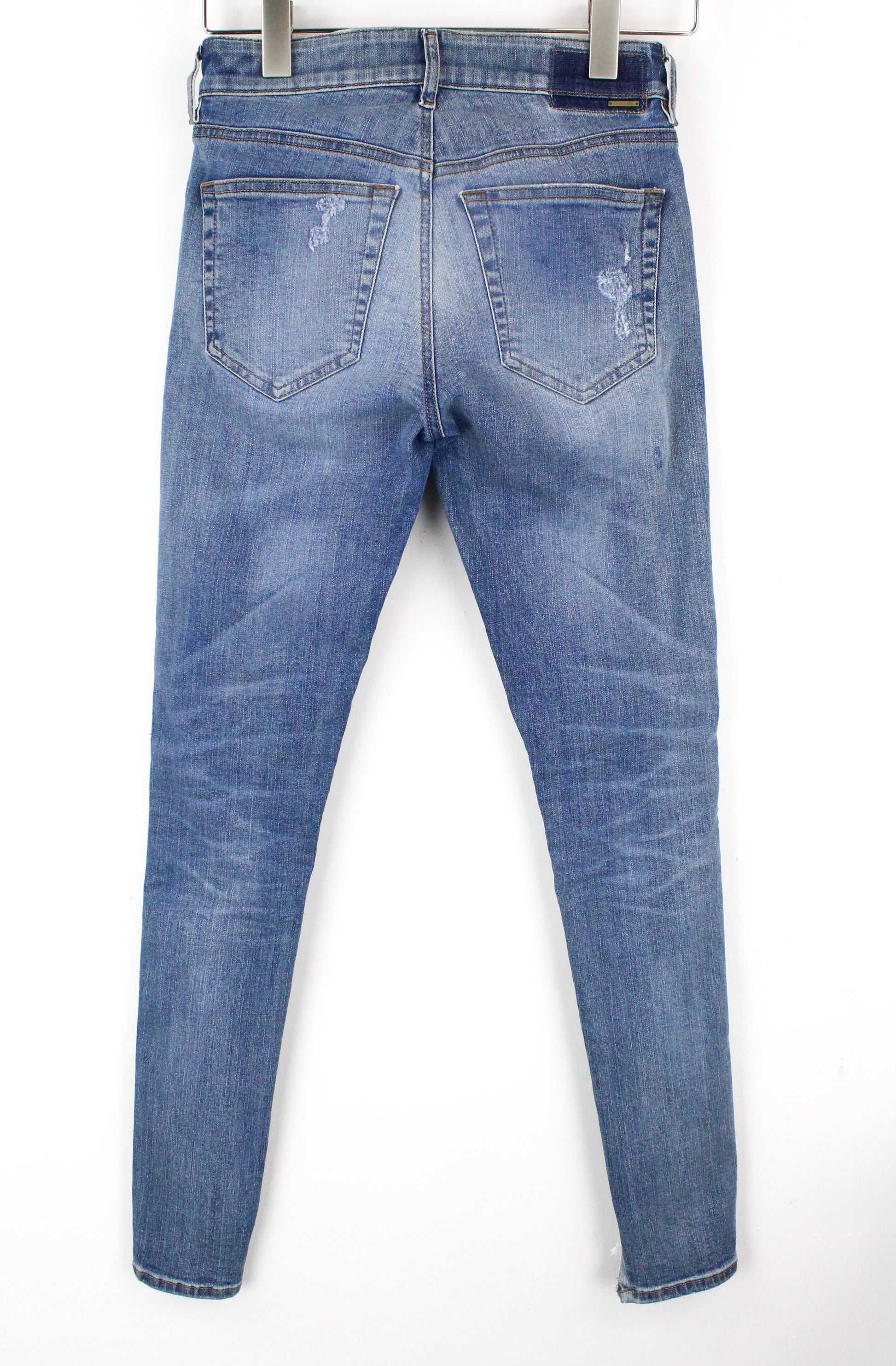 DIESEL Slandy 086AH moteriški džinsai W26/L32 tamprūs, mėlyni, plėšyti, itin ploni, aptempti