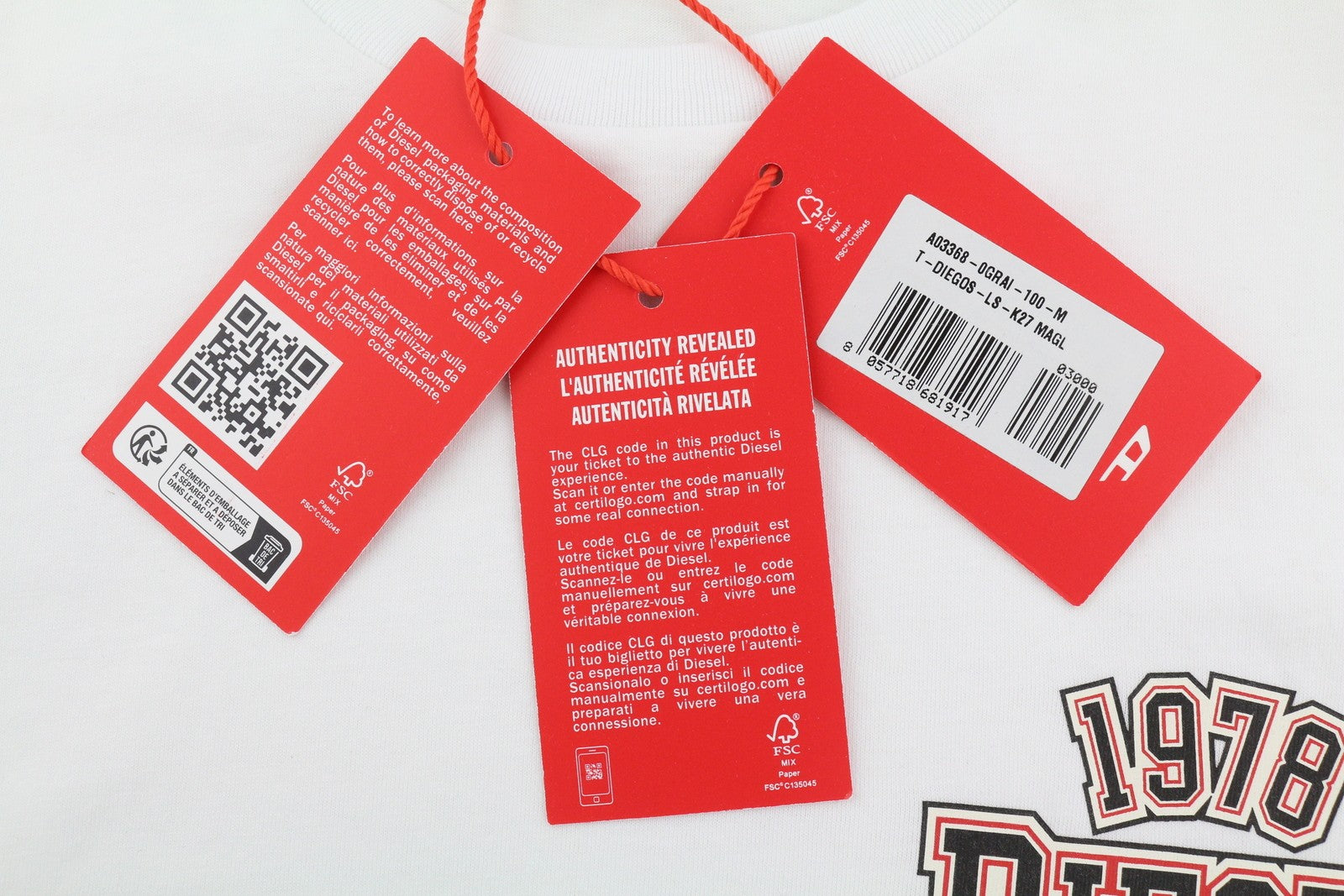 DIESEL T-Diegos-LS-K27 vyriški marškinėliai M balti medvilniniai ilgomis rankovėmis apvalios iškirptės trikotažo marškinėliai