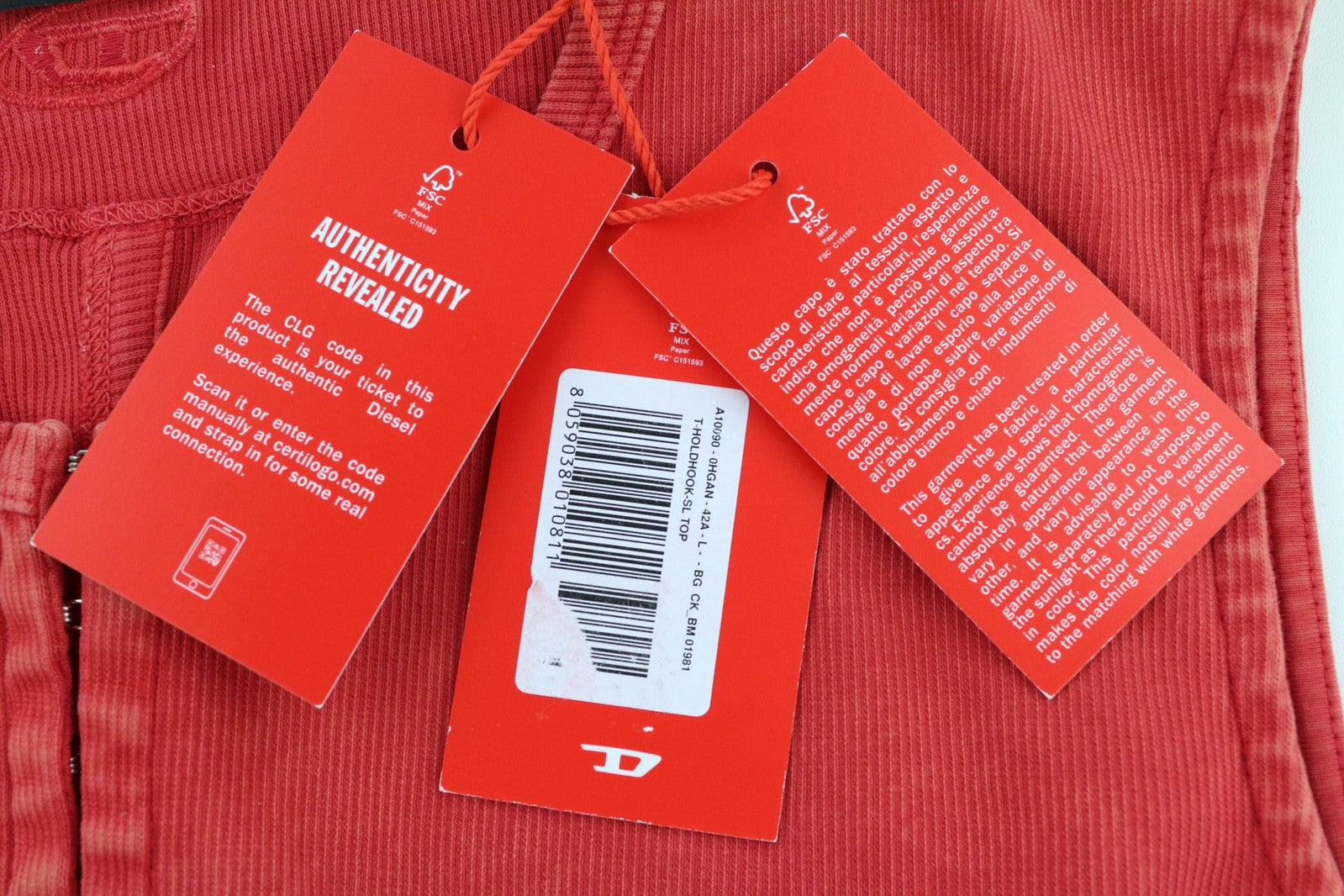 DIESEL T-Holdhook-SL moteriški marškinėliai L dydžio, raudoni be rankovių, užsegimai kabliukais ir akimis.