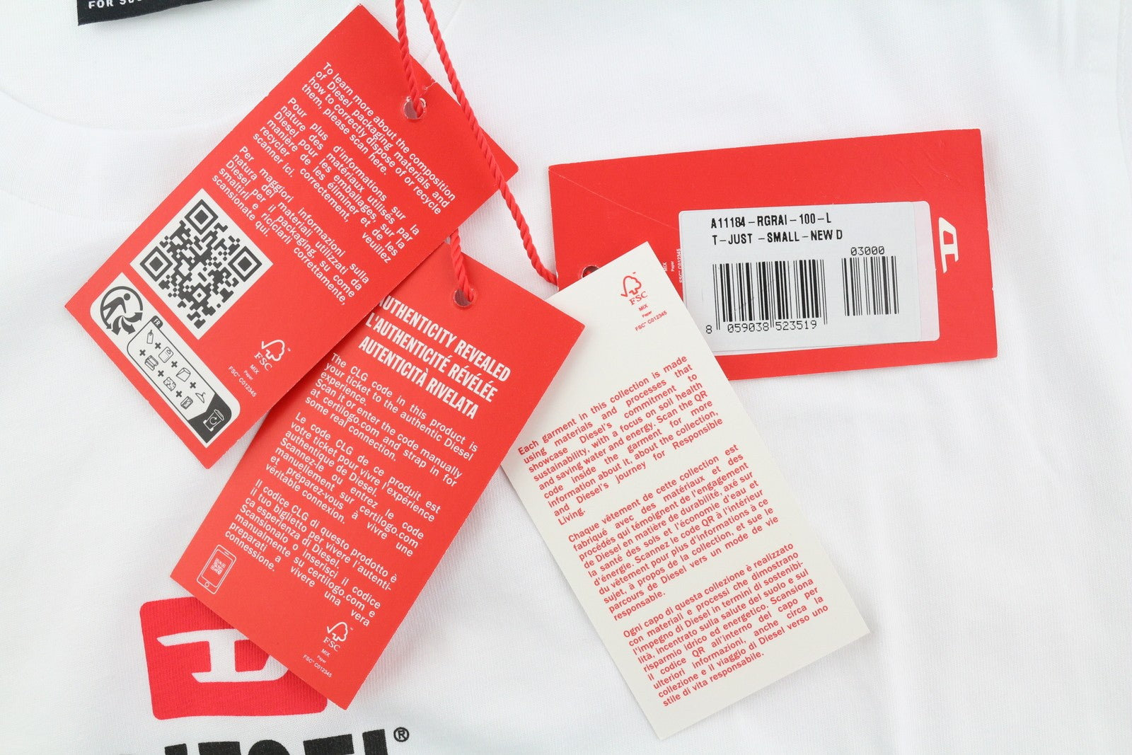 DIESEL T-Just-Small-New D Logo vyriški marškinėliai L dydžio, balti, trumpomis rankovėmis, medvilniniai