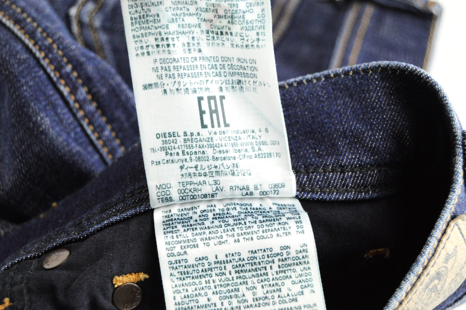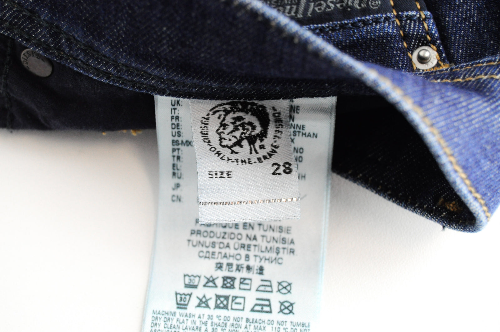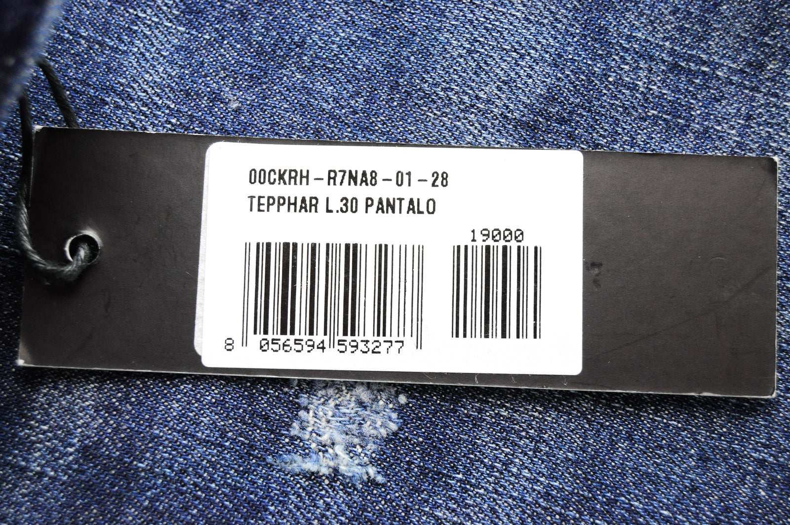 DIESEL Tepphar R7NA8 vyriški mėlyni ploni morkų rašto tamprūs džinsai W28/L30 medvilniniai