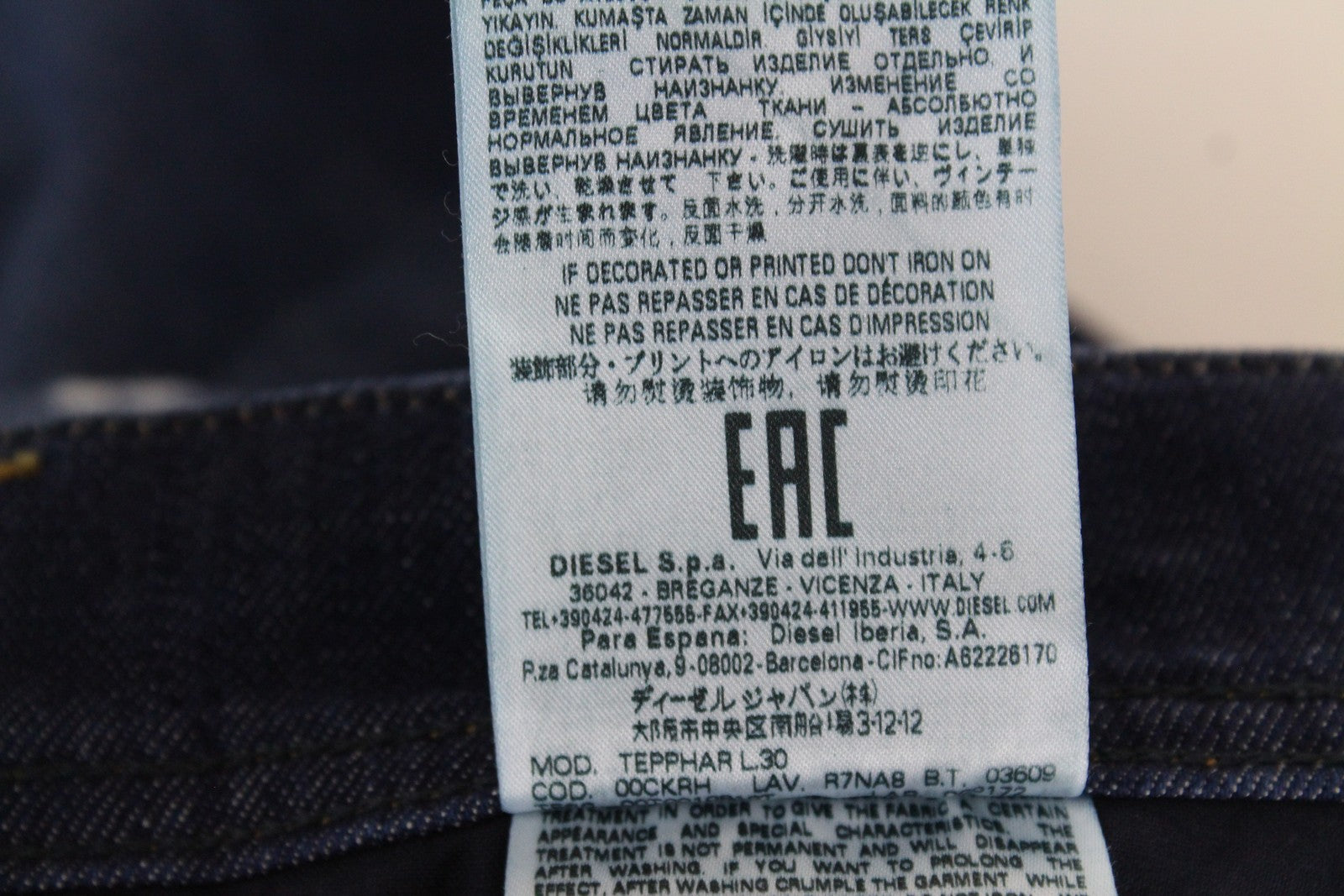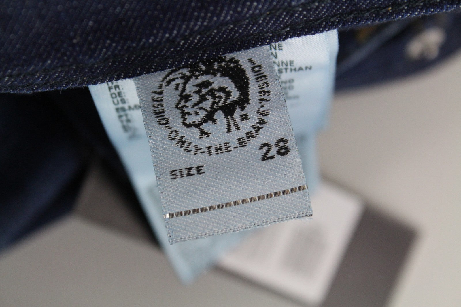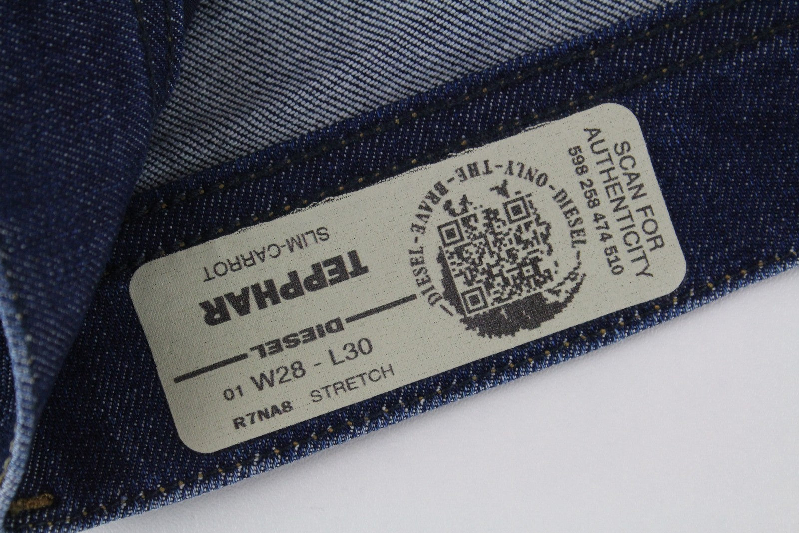 DIESEL Tepphar R7NA8 vyriški džinsai W28/L30 Slim morkų mėlynos spalvos, tamprūs, plėšyti medvilniniai džinsai