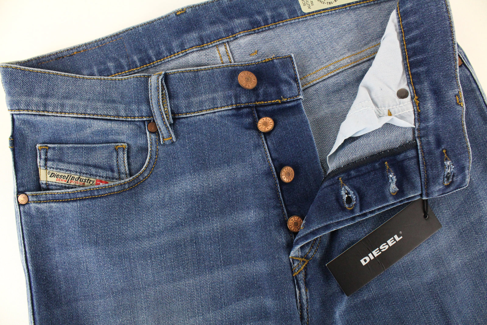 DIESEL Tepphar-X R8XA3 vyriški mėlyni džinsai W28/L34 ploni morkų spalvos medvilniniai skalbti džinsai