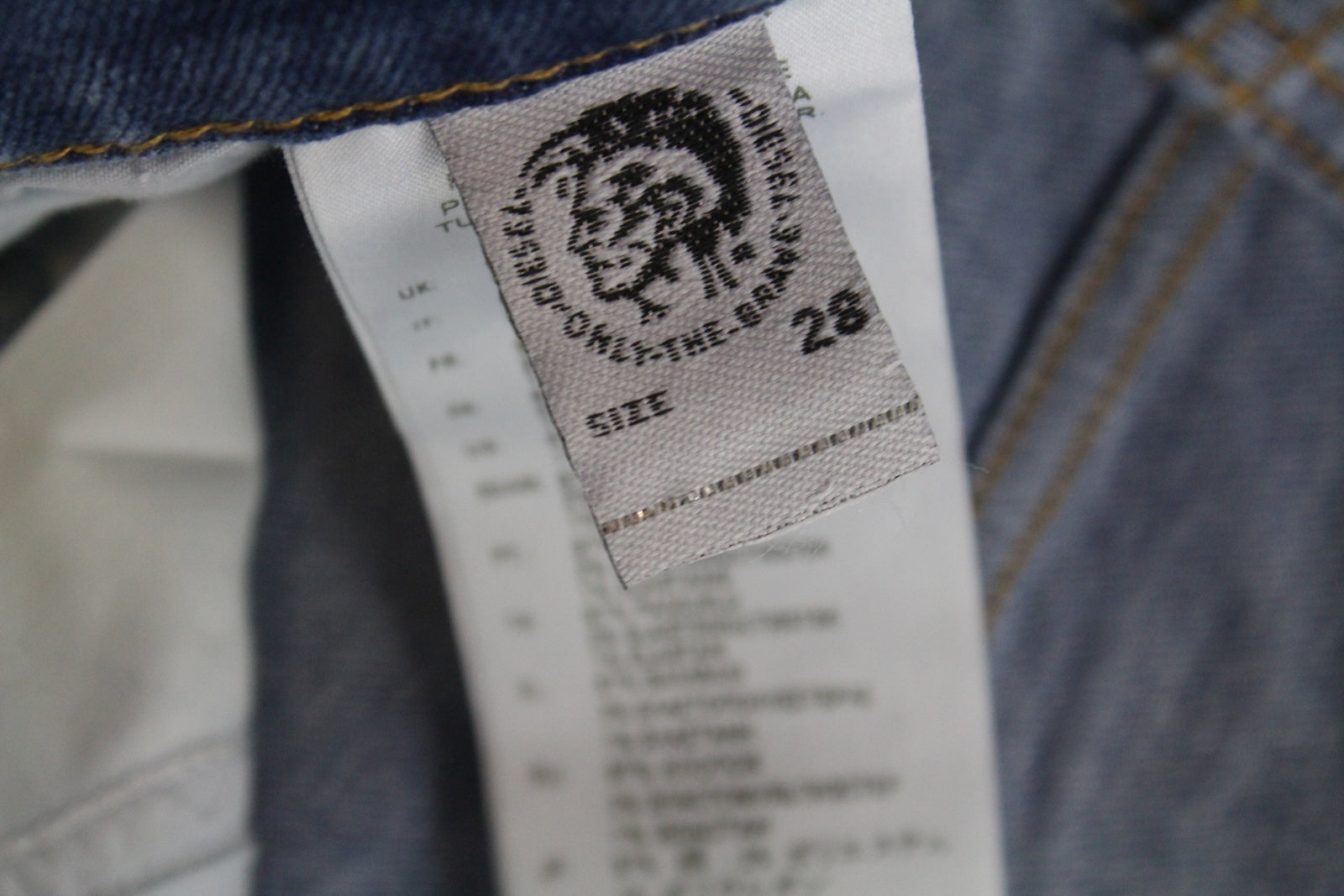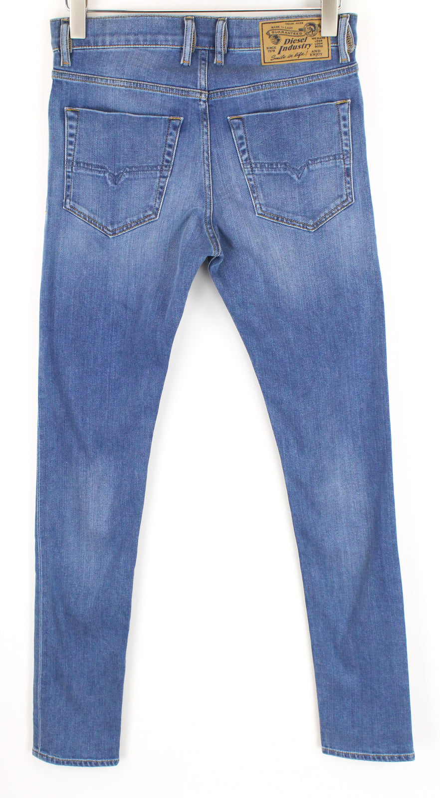 DIESEL Tepphar-X R8XA3 vyriški mėlyni ploni morkų rašto tamprūs džinsai W28/L34 su sagomis